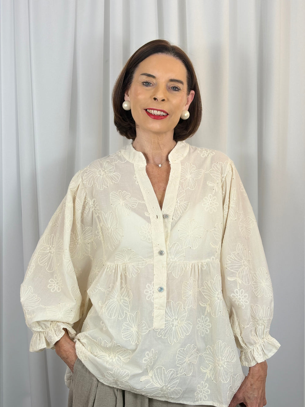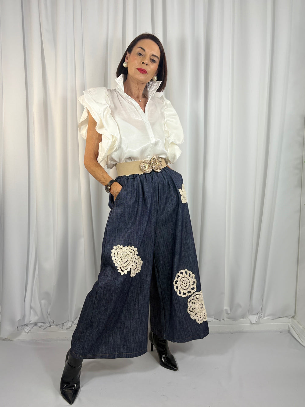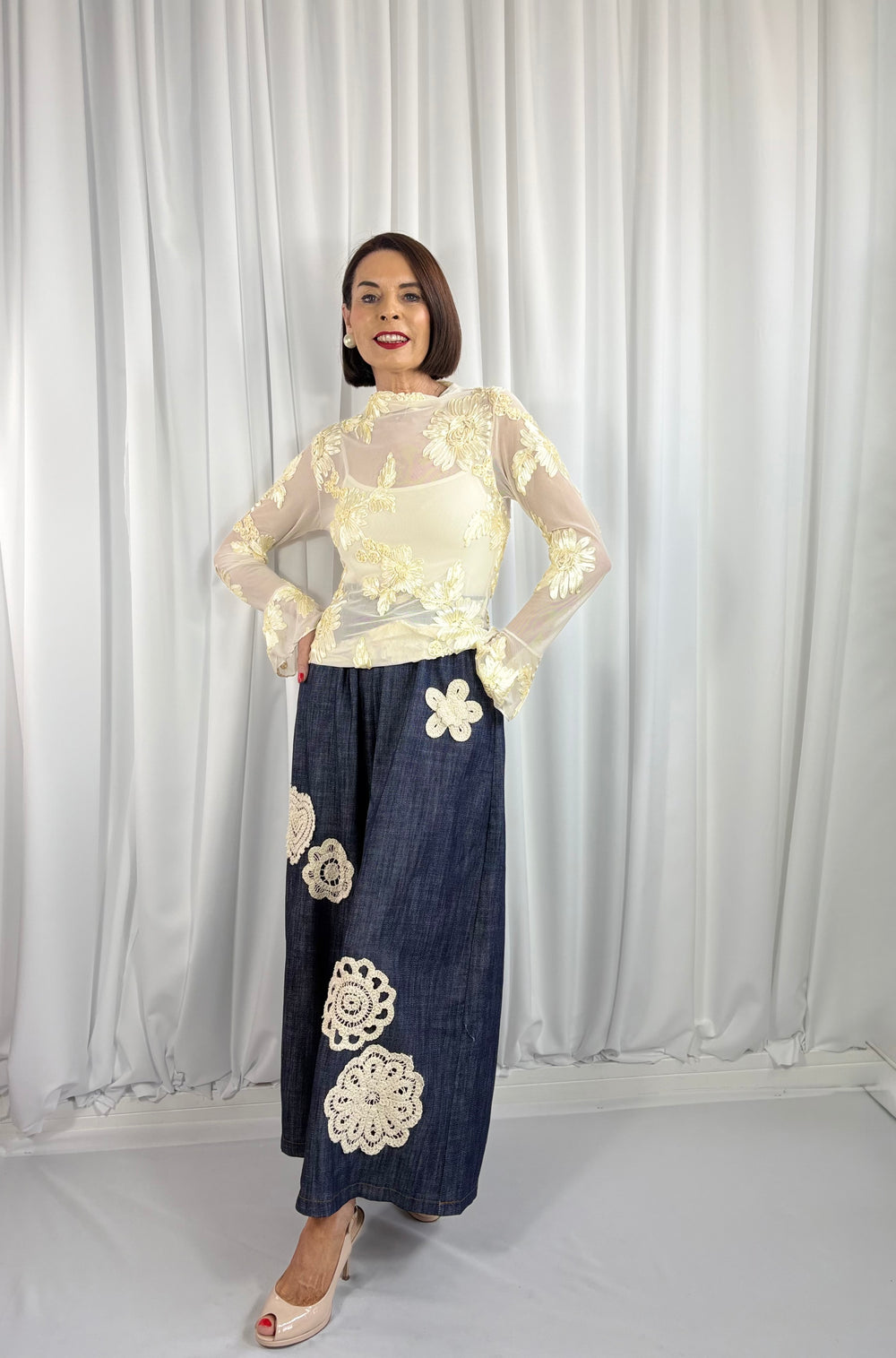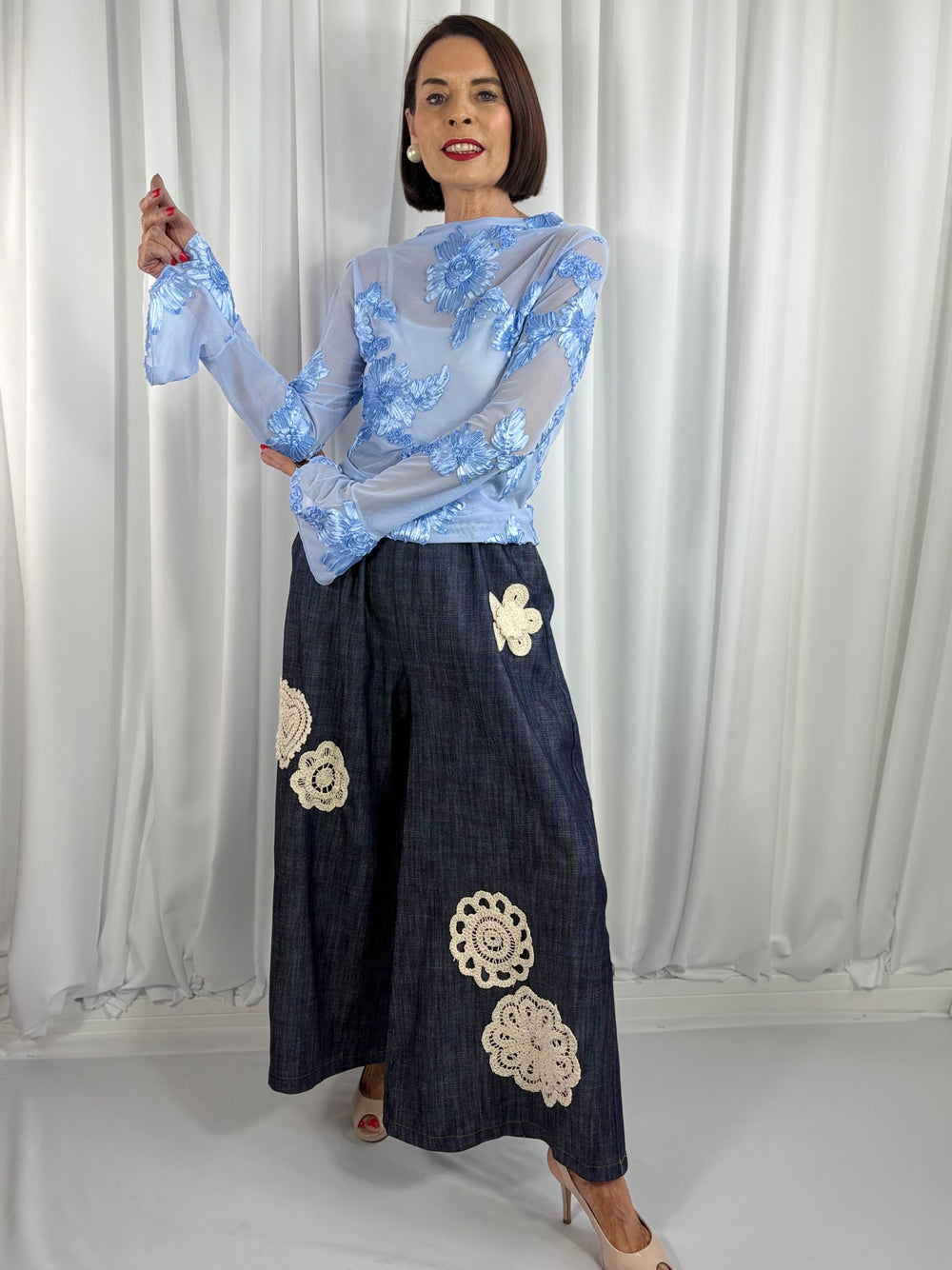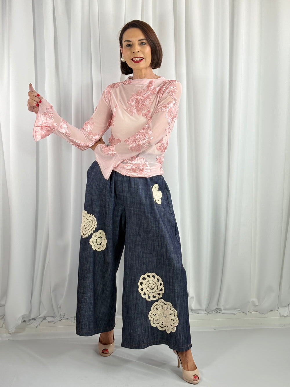 Absolutely beautiful shirt. Fits perfectly with black skinny jeans. And the sleeves are just gorgeous adds a touch of glamour to shirt. Highly recommend