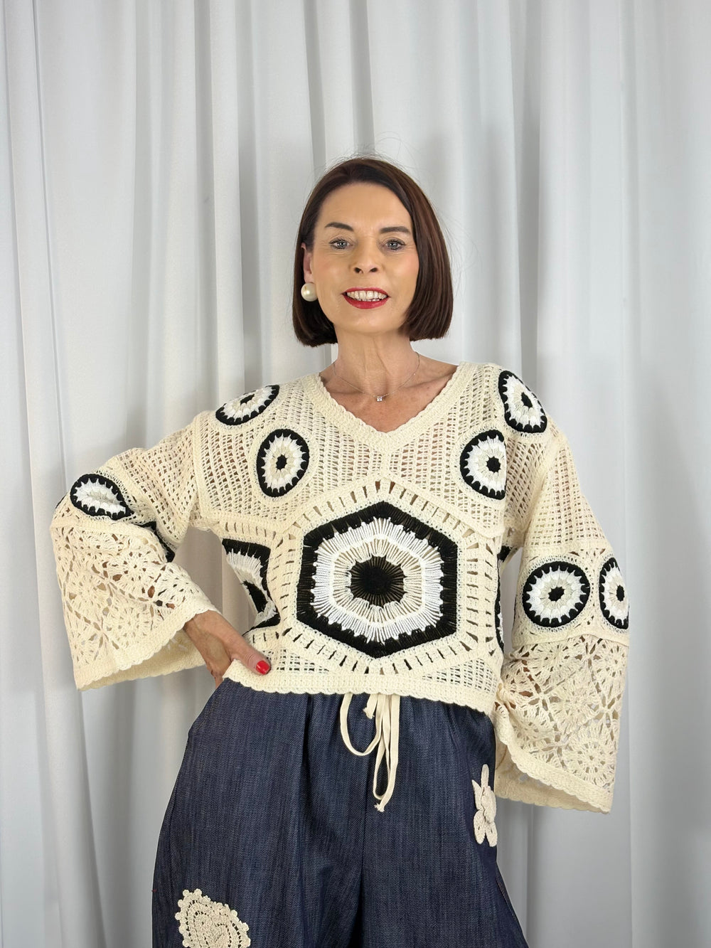 Beautiful blouse with detailed work on the cuffs and all around the bottom.