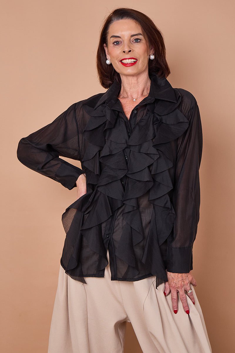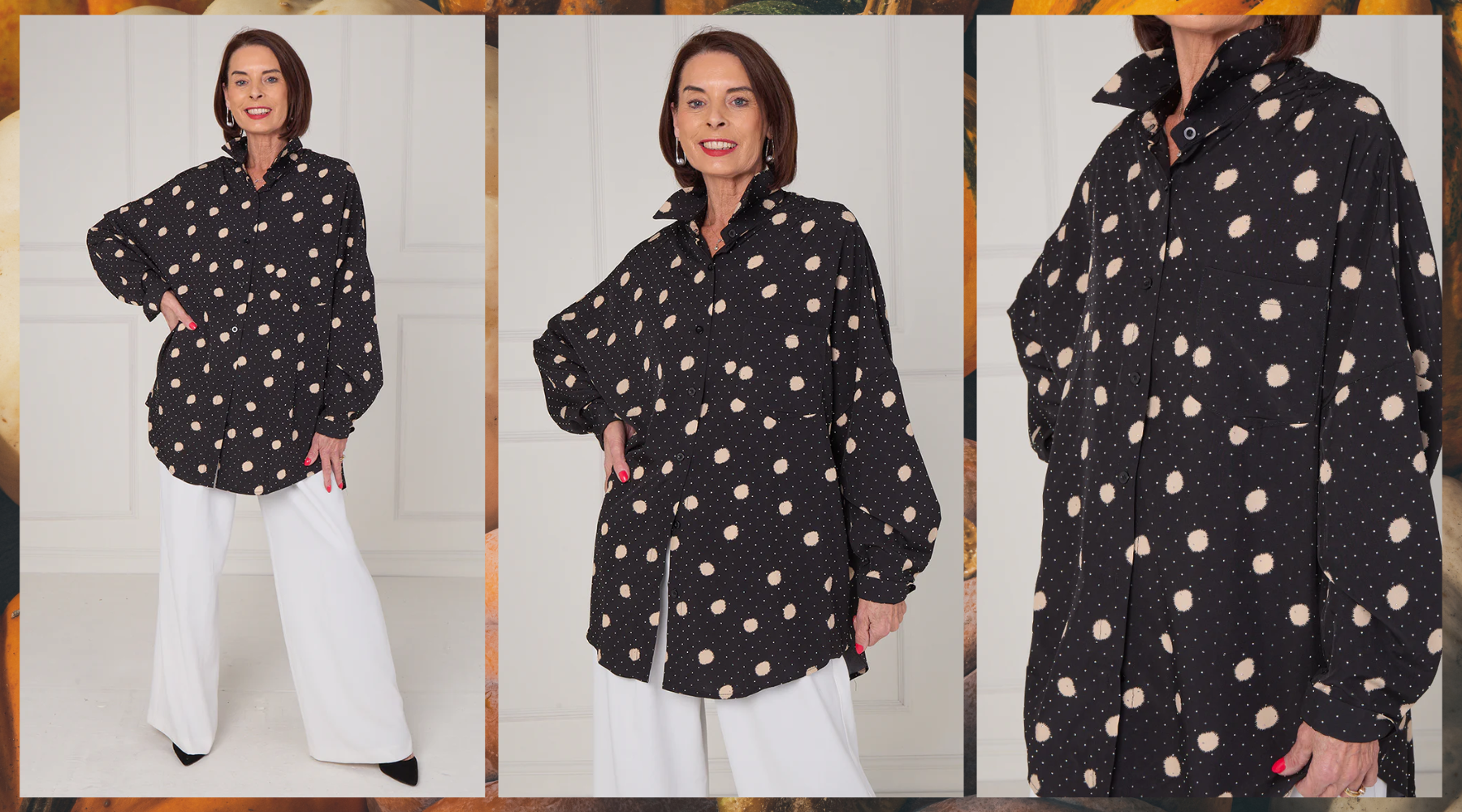 This oversized button-up blouse comes in classic black and is adorned with soft cream polka dots, giving it that retro-meets-modern edge. Scattered between the spots are subtle diamanté embellishments, adding a touch of low-key glamour. The light-catching detail is what sets this shirt apart — ideal for both daywear and dressed-up evening looks.