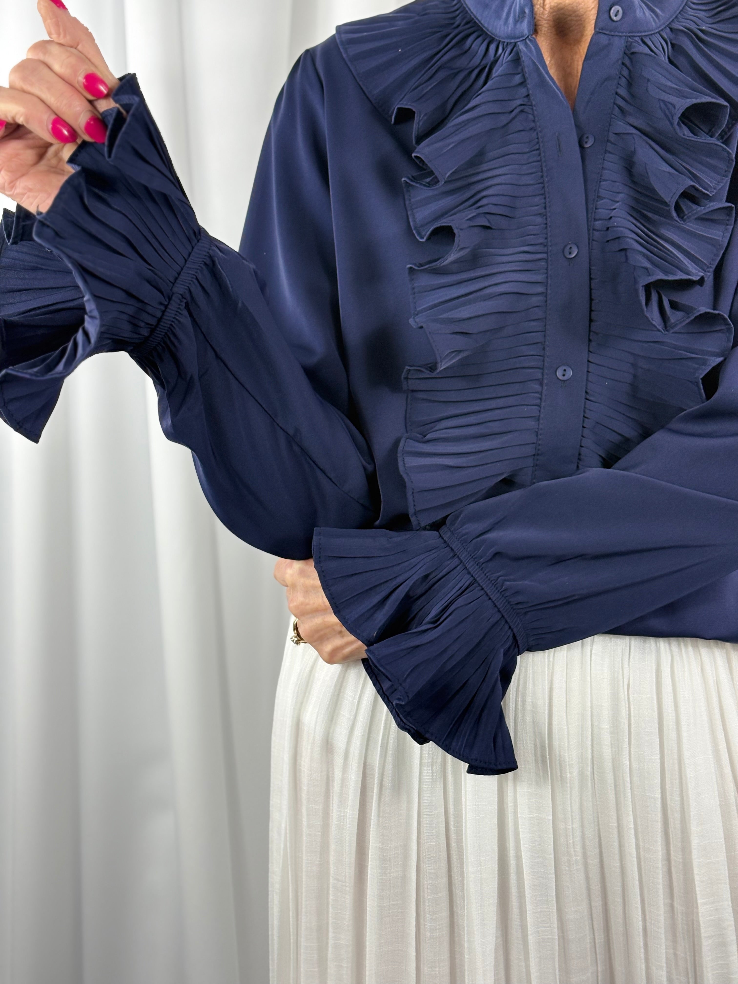 This elegant shirt is defined by delicate ruffle detailing that runs along the front placket and frames the neckline, creating a refined and feminine silhouette. Soft pleating adds texture and movement, while the structured collar lends a polished finish. The gently gathered sleeves are finished with pleated cuffs, offering a graceful balance between classic tailoring and romantic design. Crafted with a smooth, fluid feel, this shirt is perfect for elevating everyday outfits or adding sophistication to more formal looks.