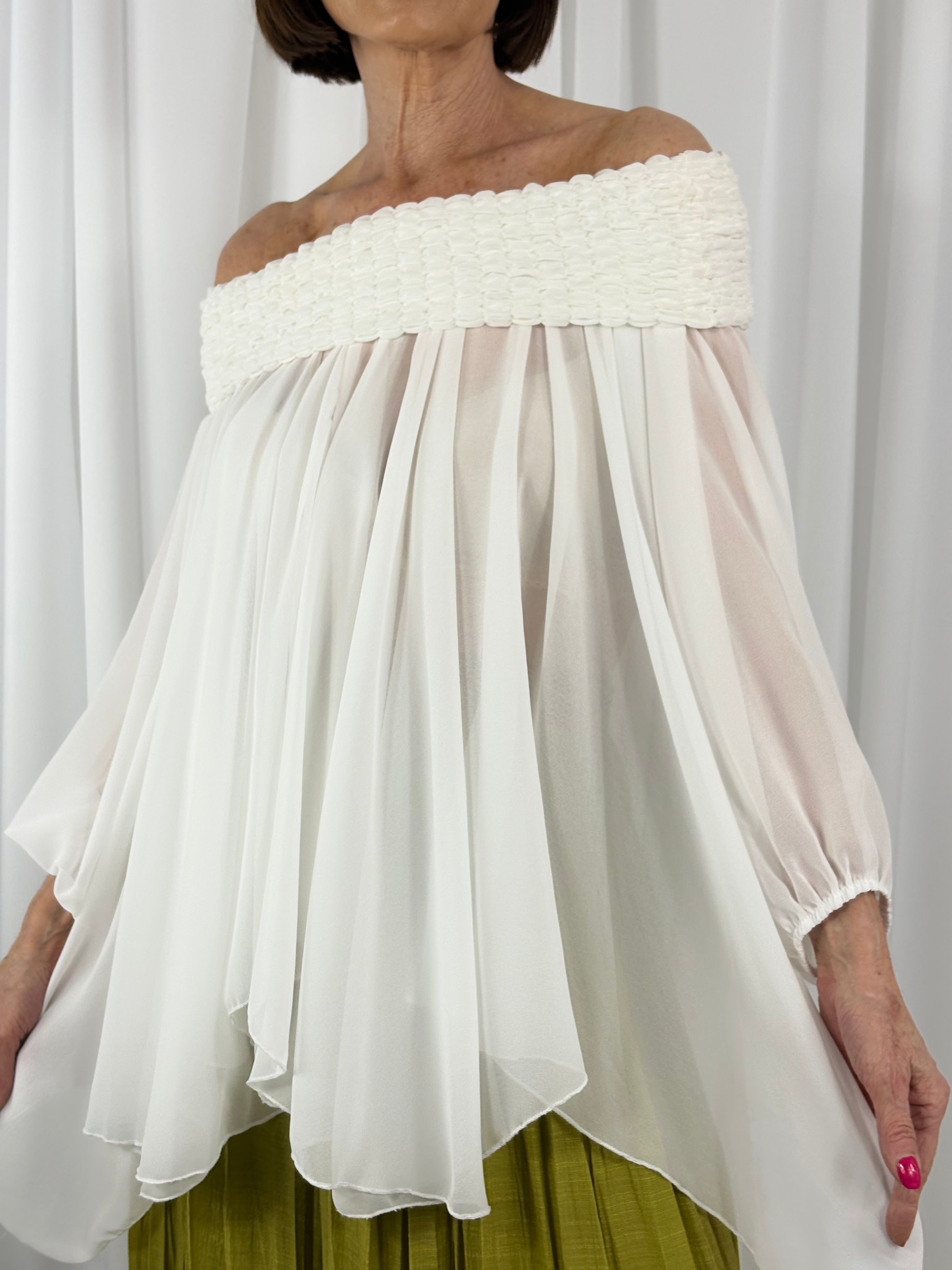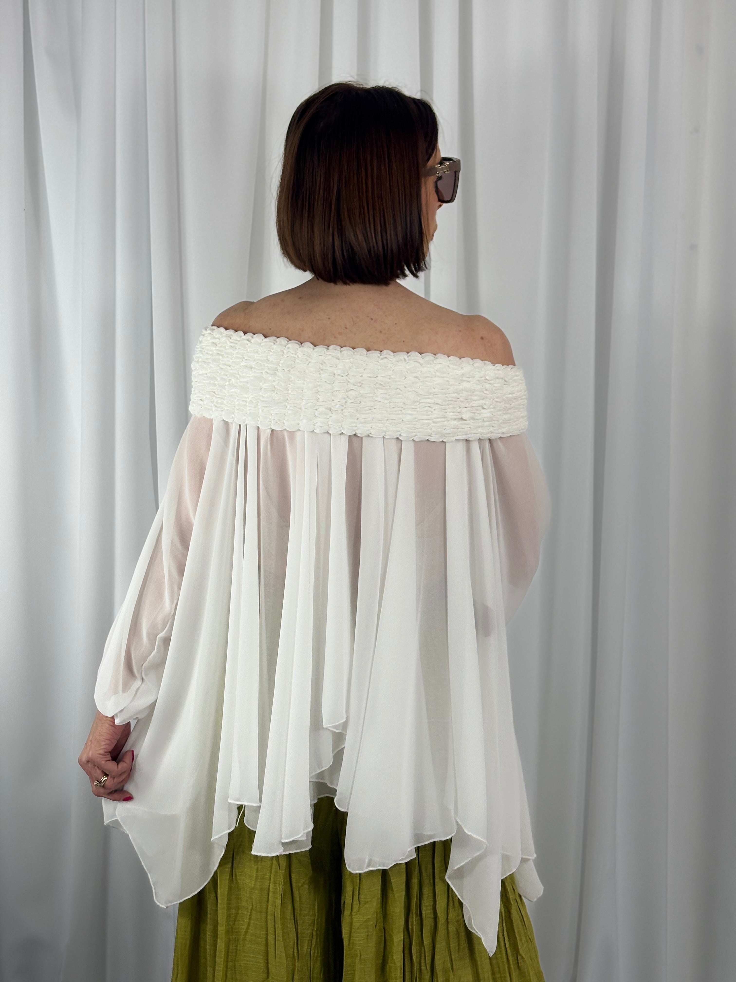 A fluid off‑shoulder waterfall top designed for effortless elegance. Featuring a softly textured neckline, airy drape, and sculpted sleeves, this piece blends contemporary romance with refined minimalism. Perfect for styling across seasons, it’s an essential statement top for modern wardrobes searching for elevated everyday wear. Ideal for searches like “women’s waterfall top,” “off‑shoulder statement top,” and “elegant draped blouse.
