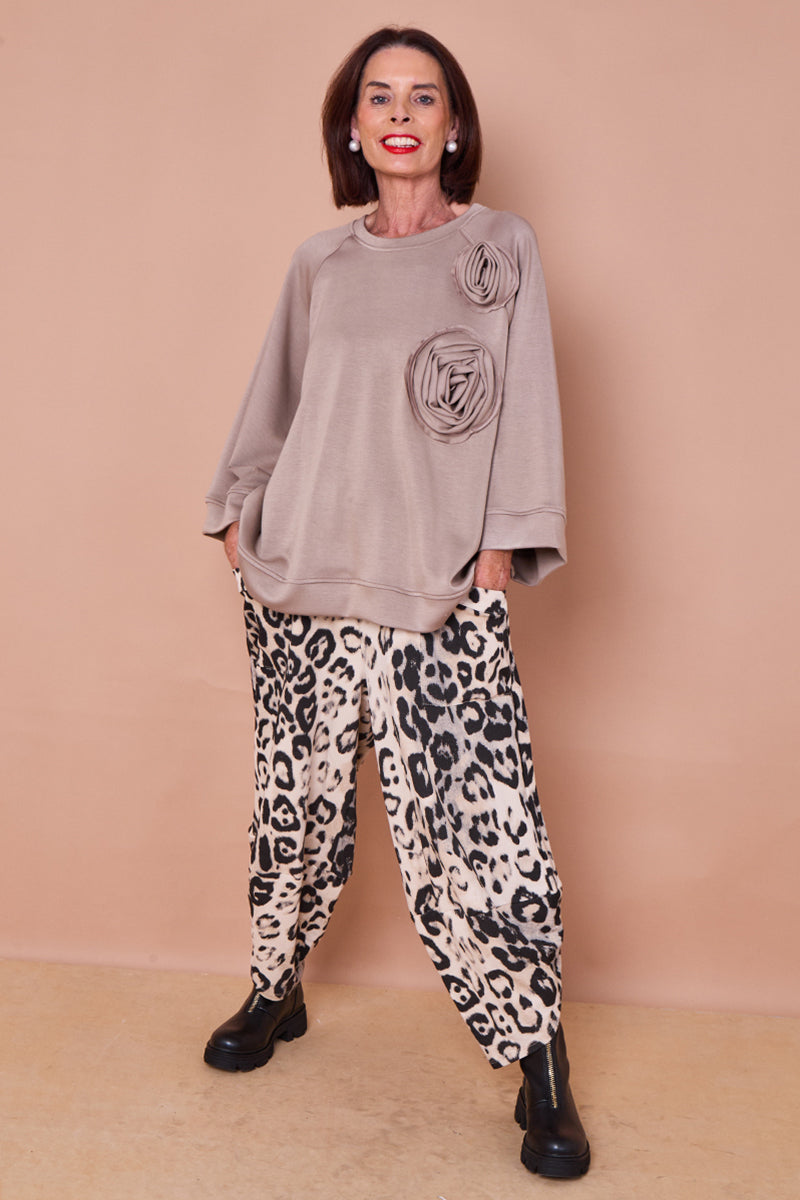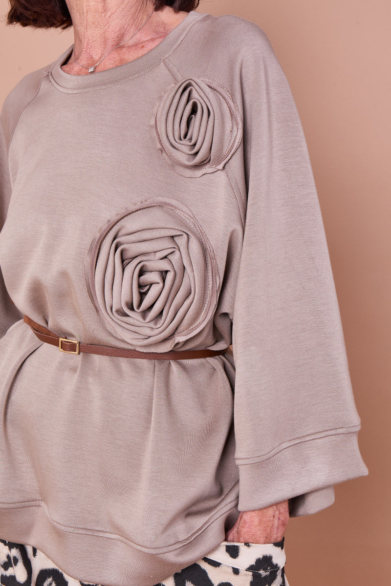 Elevate your casual wear with this exceptionally unique Sculpted Flower Appliqué Top. This knit piece features a comfortable, slightly oversized silhouette with a smooth, cozy texture. The standout details are the two large, intricately layered fabric flower appliqués positioned on the shoulder and chest, adding a three-dimensional, artistic touch. The top boasts a classic crew neckline and relaxed three-quarter length sleeves.