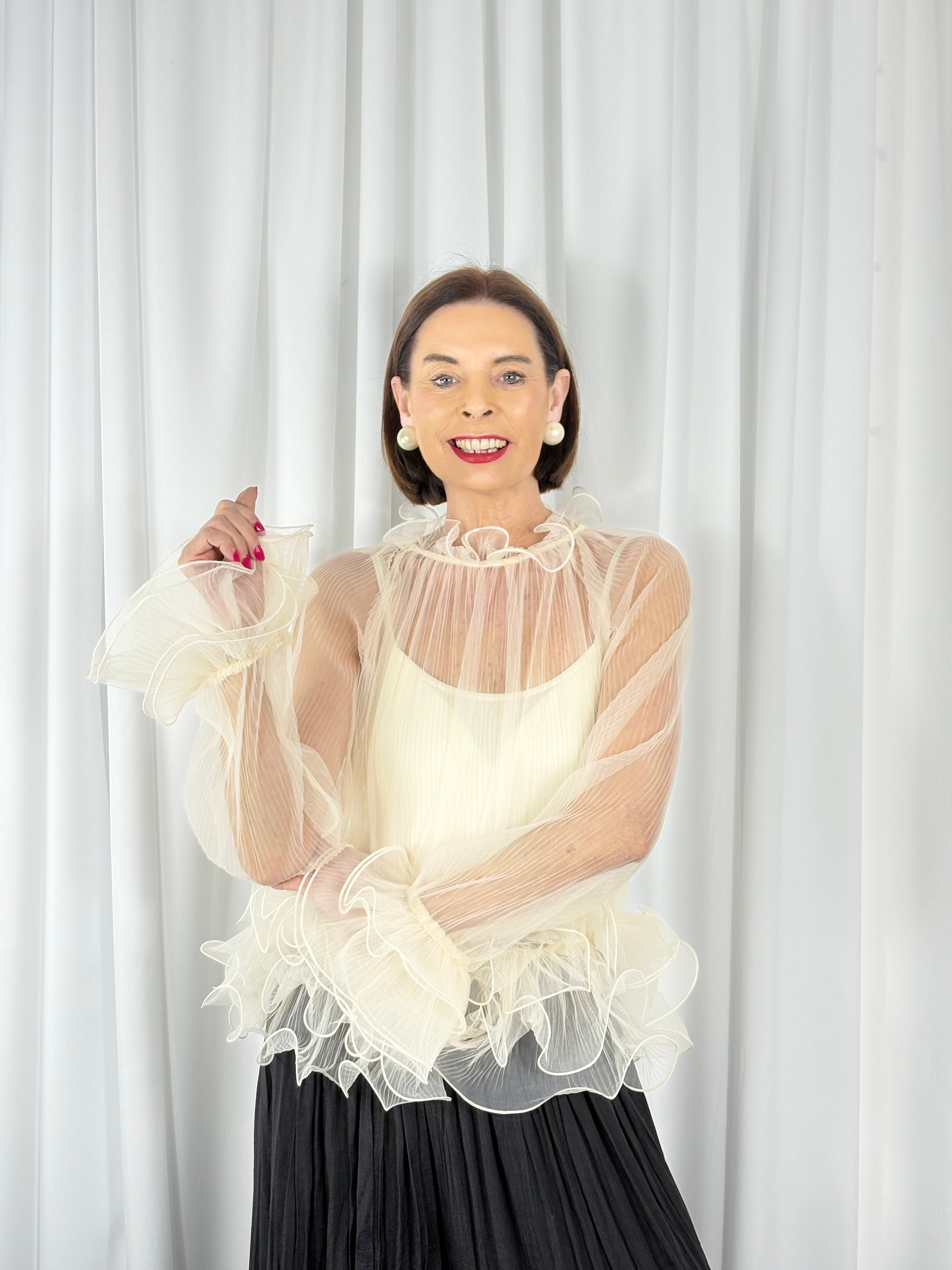 A romantic high-fashion top crafted from sheer, lightweight tulle. Designed with a dramatic high ruffled neckline for an elegant statement. Features soft gathered detailing at the waist for a sculptural silhouette. Voluminous long sleeves finished with pronounced ruffled cuffs. Comes paired with a coordinating vest for a complete, polished look.