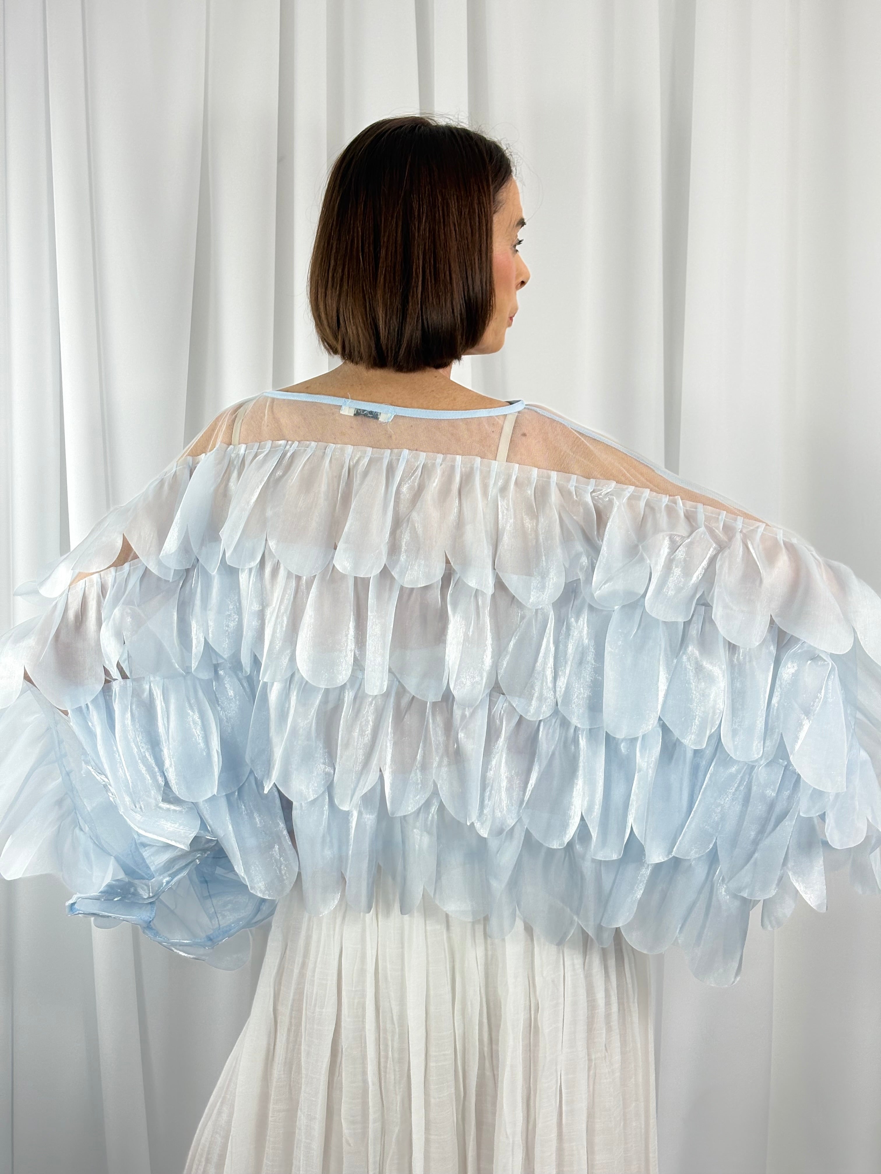 This top is an ethereal, statement-making piece defined by its dramatic volume and intricate texture. Crafted from a sheer, lightweight fabric, it features a delicate illusion-style neckline that sits high and wide across the collarbones, creating a soft, elegant frame around the shoulders. The bodice and sleeves are adorned with multiple layers of petal-shaped appliqués that overlap to form a richly dimensional, feather-like effect, giving the garment movement and depth from every angle.