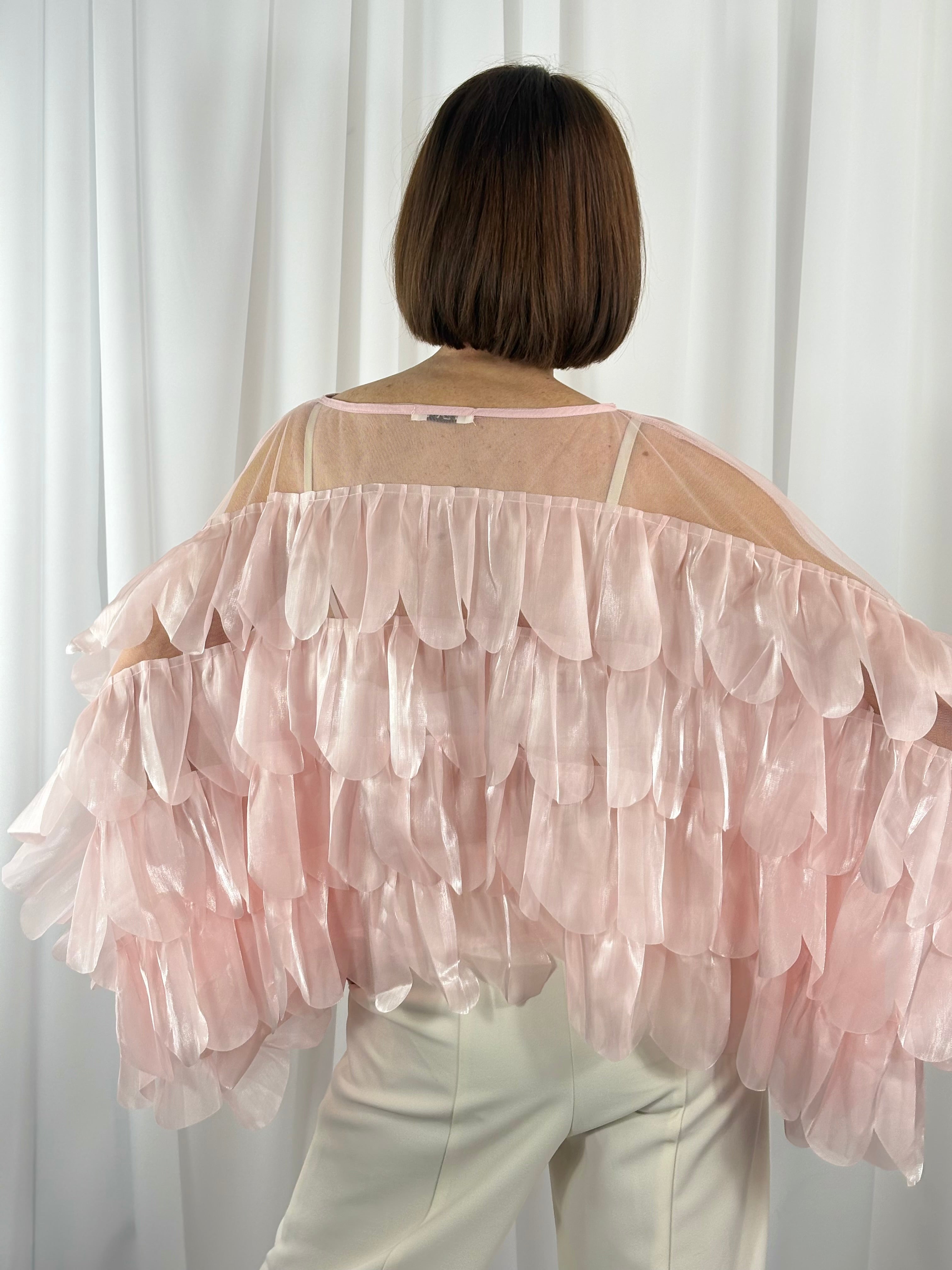 This top is an ethereal, statement-making piece defined by its dramatic volume and intricate texture. Crafted from a sheer, lightweight fabric, it features a delicate illusion-style neckline that sits high and wide across the collarbones, creating a soft, elegant frame around the shoulders. The bodice and sleeves are adorned with multiple layers of petal-shaped appliqués that overlap to form a richly dimensional, feather-like effect, giving the garment movement and depth from every angle.