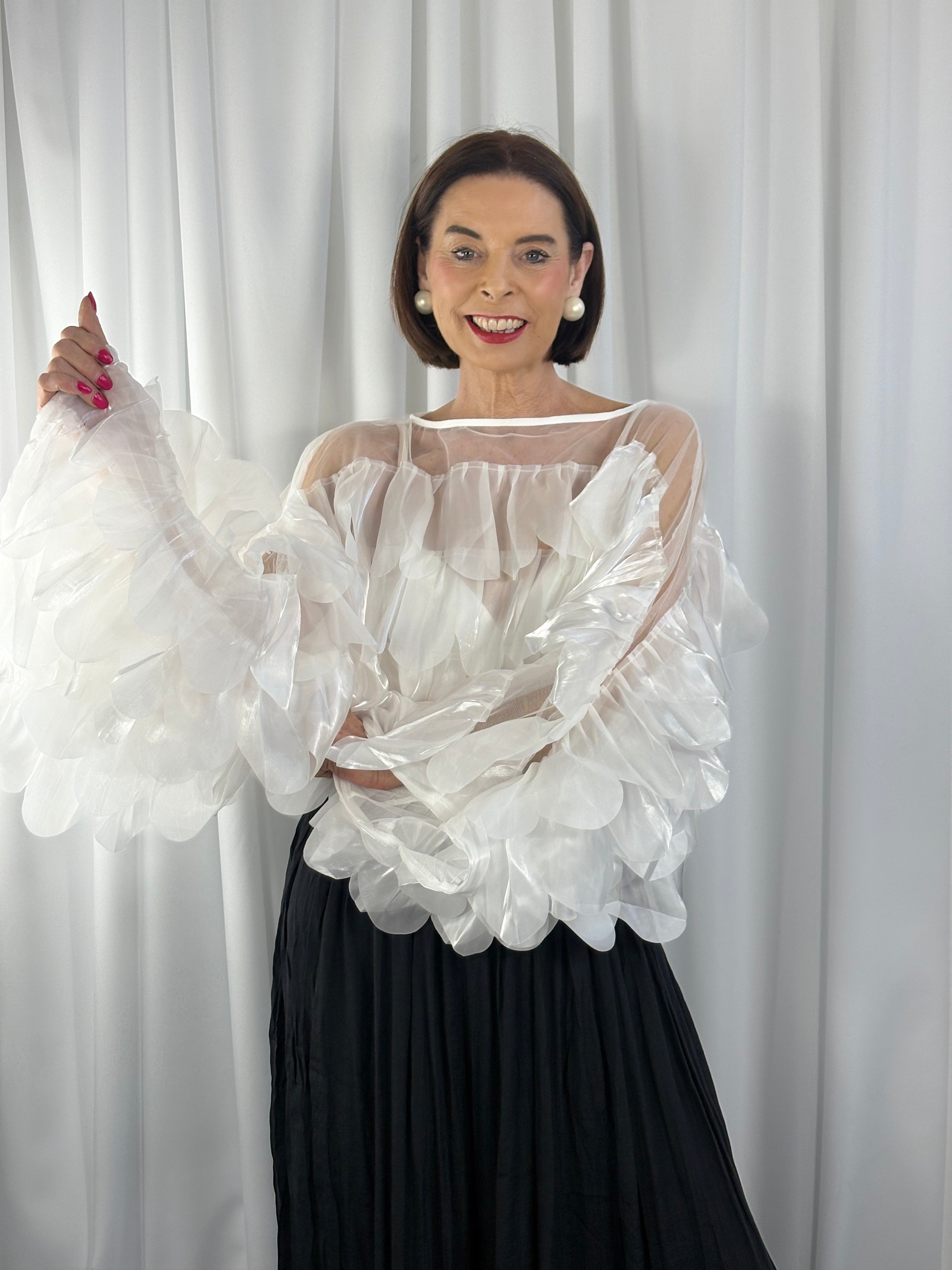 This top is an ethereal, statement-making piece defined by its dramatic volume and intricate texture. Crafted from a sheer, lightweight fabric, it features a delicate illusion-style neckline that sits high and wide across the collarbones, creating a soft, elegant frame around the shoulders. The bodice and sleeves are adorned with multiple layers of petal-shaped appliqués that overlap to form a richly dimensional, feather-like effect, giving the garment movement and depth from every angle.