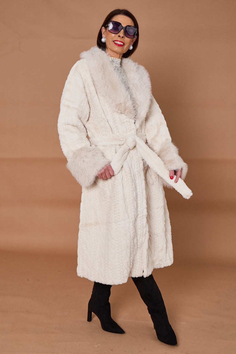 This is a luxurious and voluminous coat featuring a textured, deep-pile faux fur material. It is styled as a classic wrap coat, which secures with a matching tie belt at the waist, allowing the wearer to cinch the silhouette for a defined shape or wear it open for a more relaxed look. The coat has a wide, shawl-style collar and substantial cuffs, enhancing its plush feel. It is cut to a long length, providing excellent coverage, and is designed for a flattering drape.