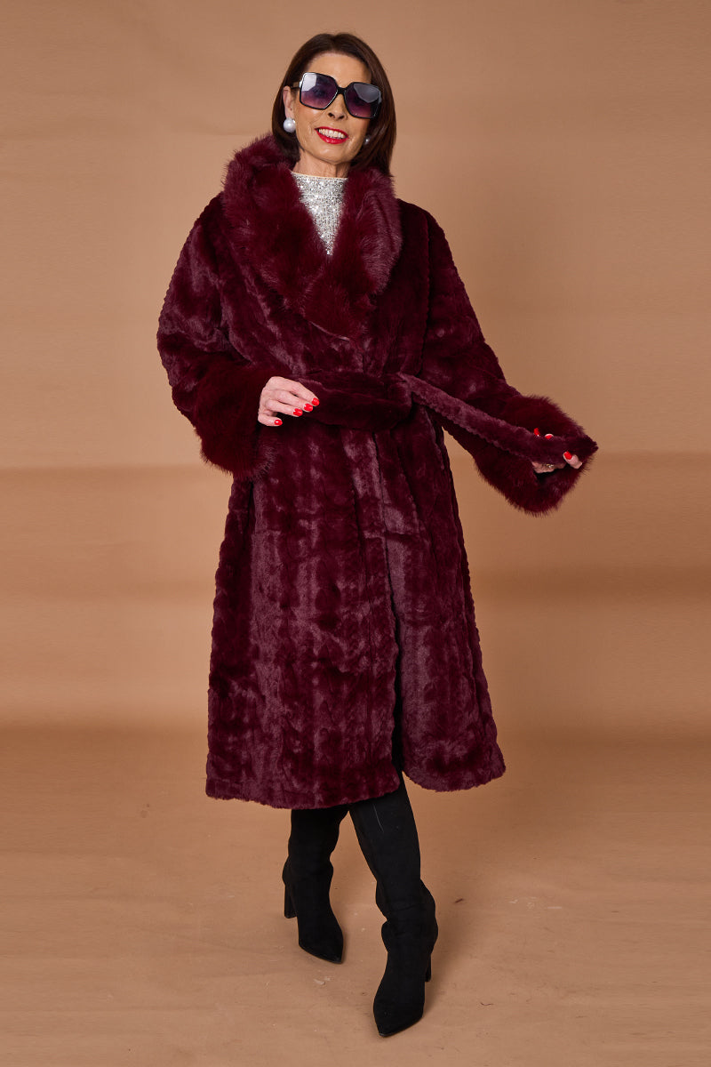 This is a luxurious and voluminous coat featuring a textured, deep-pile faux fur material. It is styled as a classic wrap coat, which secures with a matching tie belt at the waist, allowing the wearer to cinch the silhouette for a defined shape or wear it open for a more relaxed look. The coat has a wide, shawl-style collar and substantial cuffs, enhancing its plush feel. It is cut to a long length, providing excellent coverage, and is designed for a flattering drape.