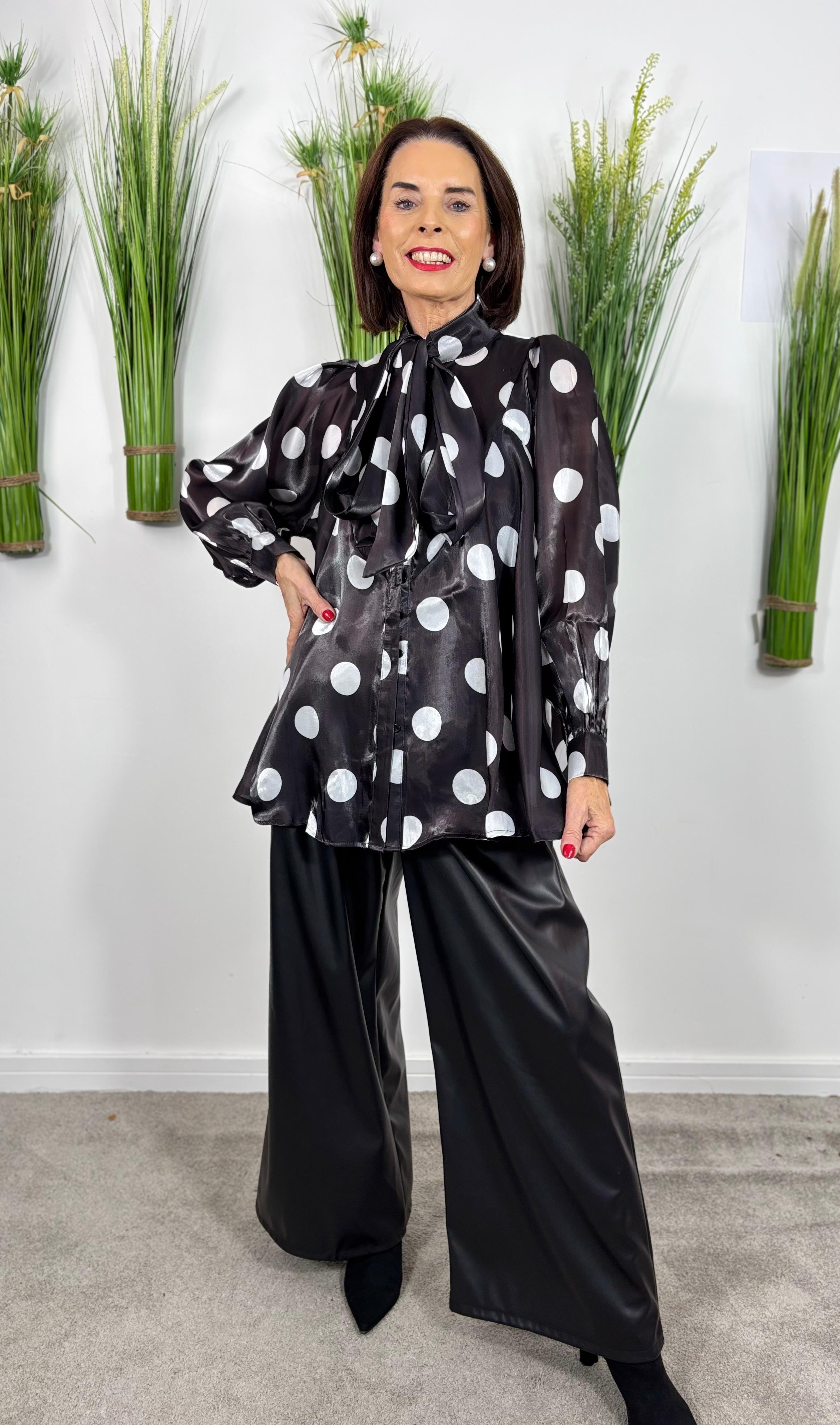 This elegant garment is a tunic-length blouse crafted from a high-sheen, satin-like fabric in crisp black, which provides a luxurious drape and fluid movement. It features a striking pattern of large, uniformly-sized white polka dots throughout. The design is highly sophisticated, defined by a high-neck pussy-bow tie that can be styled into a voluminous waterfall bow, adding a dramatic, vintage-inspired touch. The silhouette is enhanced by long, full lantern-style sleeves that gather neatly at the cuff.