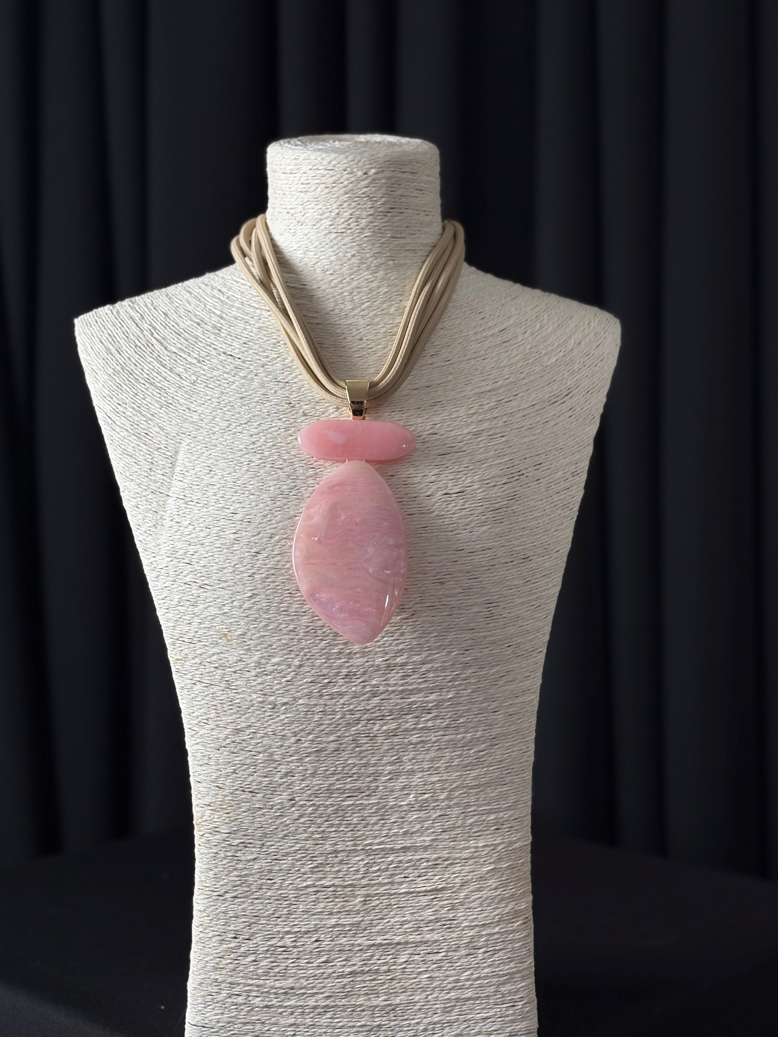 A layered cord meets a pair of smooth, sculptural pendants, creating a piece that feels bold yet composed. The gathered strands give the necklace a sense of strength and modernity, while the two stacked forms one rounded, one elongated introduce a refined, organic balance. Their polished surfaces catch the light softly, drawing the eye without overwhelming it.