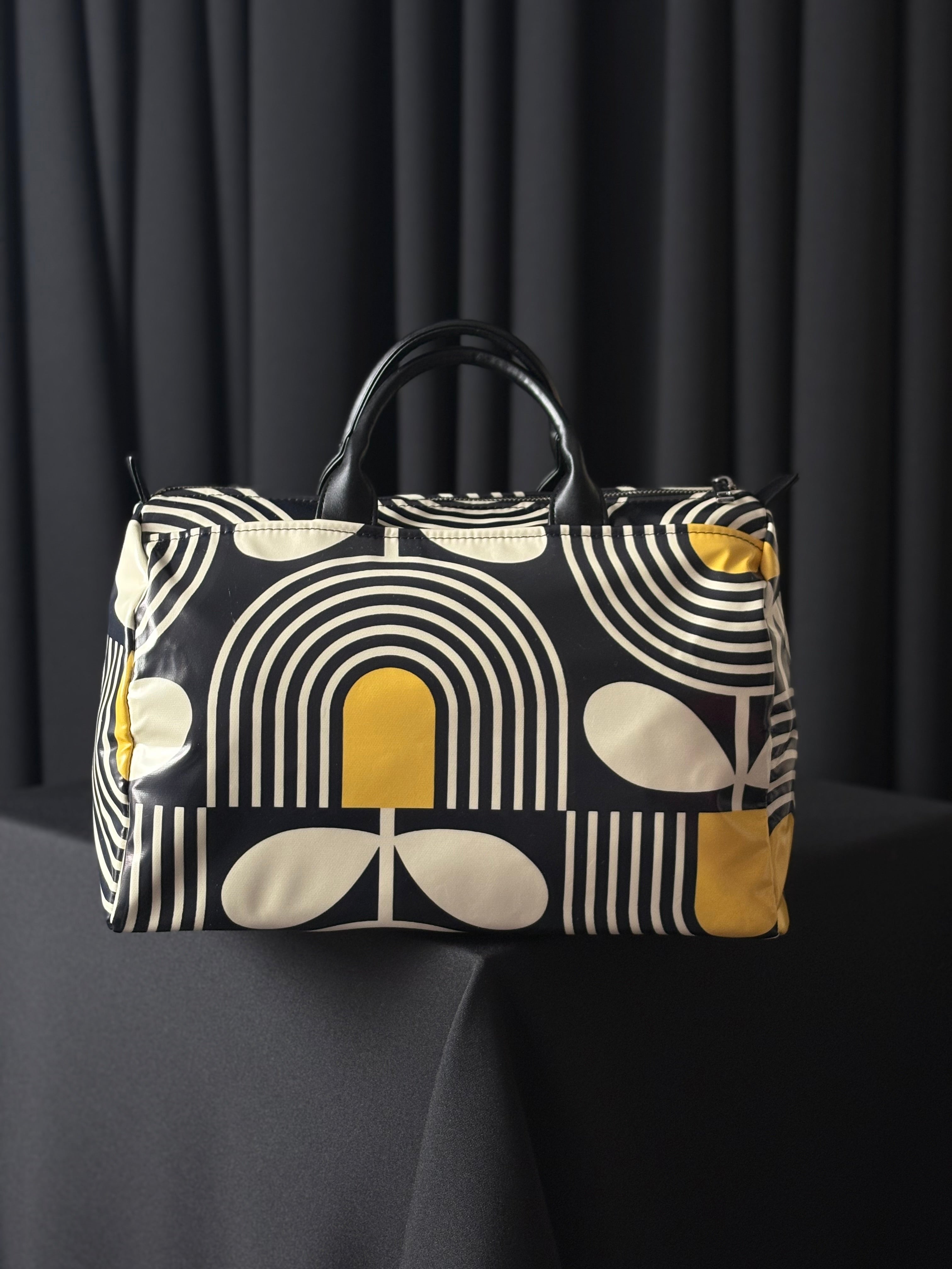 Sturdy top handles provide comfortable carrying, while the zippered closure keeps items secure. Its roomy interior offers enough space for essentials like a phone, wallet, and cosmetics. The unique patterned design gives the bag a stylish and contemporary character.