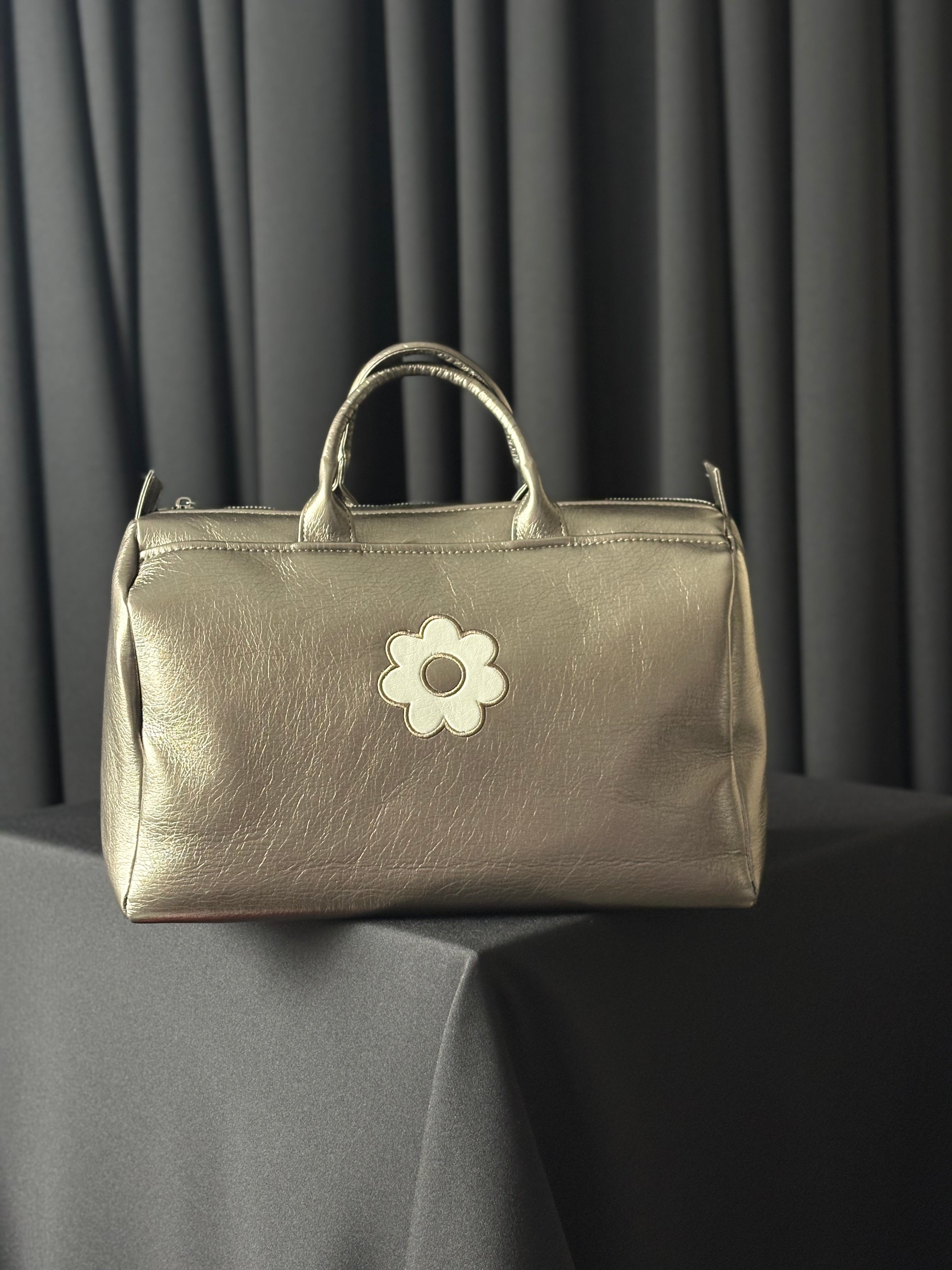 A flower-shaped emblem on the front adds a playful and distinctive touch.