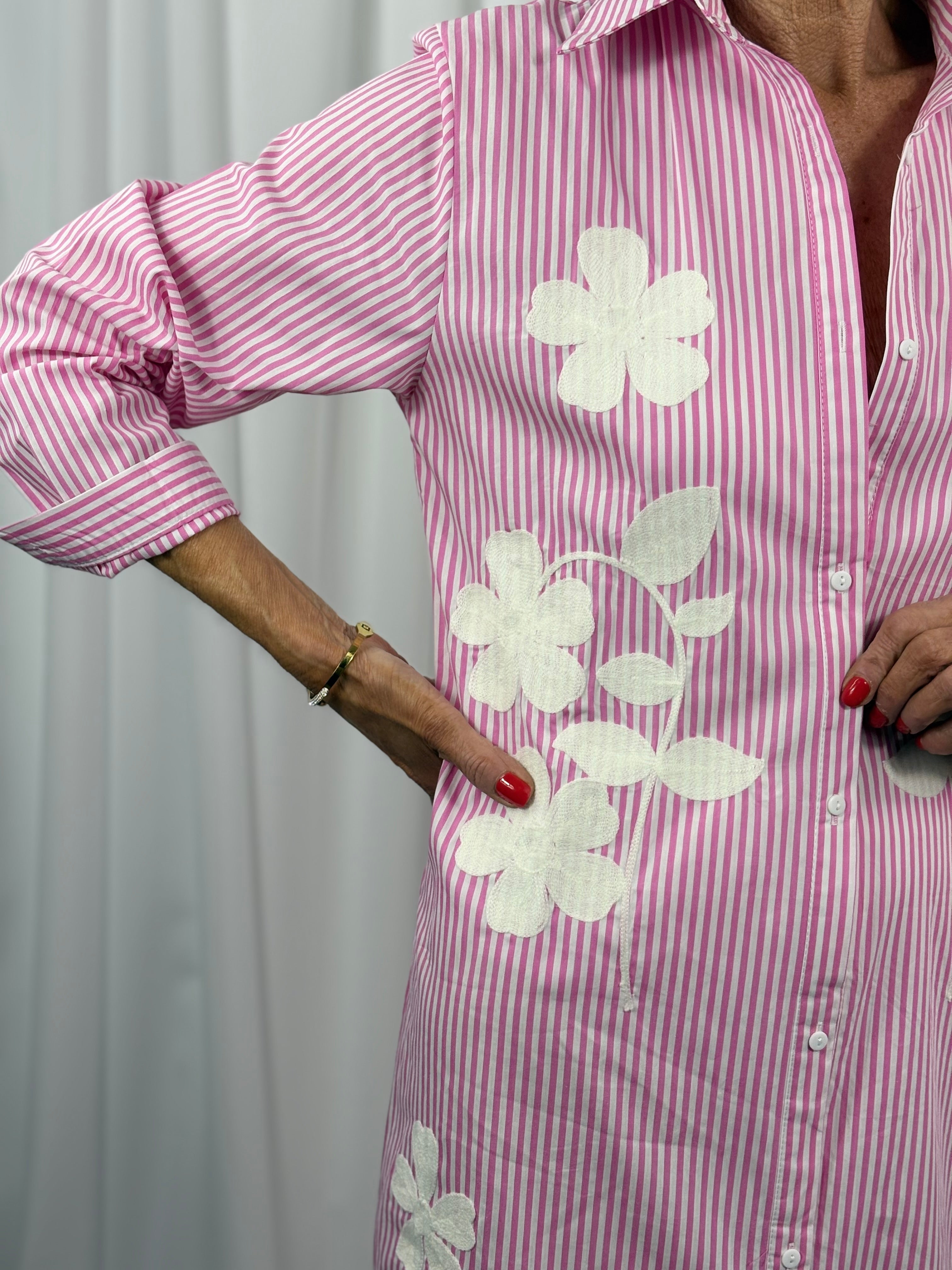 A relaxed, tailored dress reimagined with bold dimensional detailing. Vertical stripes create a refined rhythm across the silhouette, while oversized floral appliqués introduce sculptural contrast and texture. The fit is intentionally easy, designed to drape with effortless confidence, and the front is finished with classic button fastening for a polished balance between structure and playfulness. A statement piece that merges pattern, form, and craftsmanship into a modern wardrobe essential.
