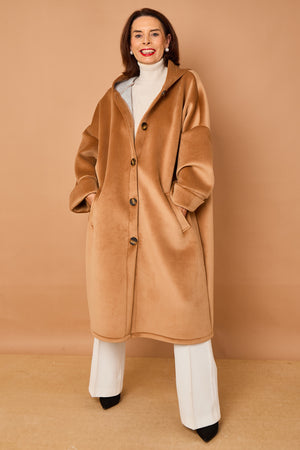 This long coat features a relaxed, oversized silhouette with a cozy hood that adds both comfort and style. Designed with a clean, minimalist look, it is detailed with large front buttons and two practical side pockets, perfect for keeping your hands warm or carrying small essentials. The wide sleeves and smooth finish give it a modern, effortlessly chic appeal, making it an ideal layering piece for cooler days.