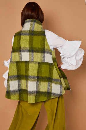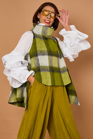 The tank top in the image is a sleeveless, high-neck vest with a soft, structured texture and a relaxed, slightly boxy silhouette. It features a large check pattern and side slits, allowing for comfortable layering. The design pairs effortlessly with statement blouses or shirts, adding a modern and elegant touch to any outfit. The high neckline and clean lines give it a contemporary, sculptural feel that blends sophistication with everyday wearability.
