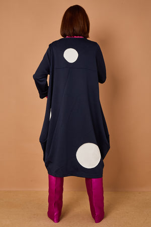 This jacket showcases a modern oversized silhouette with bold circular accents that add a playful touch. Designed with a front zip closure, it combines practicality with contemporary style. The relaxed fit and softly draped fabric create a flattering, comfortable shape. Rolled cuffs and spacious side pockets enhance its casual sophistication. Perfect for layering, this statement piece effortlessly blends comfort and creativity.