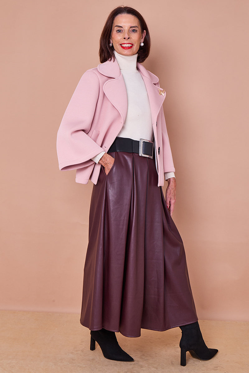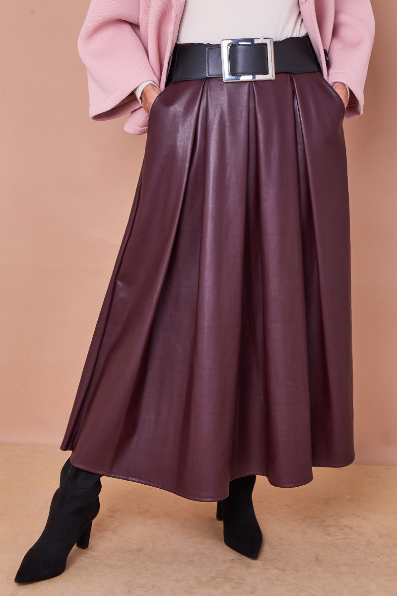 This statement skirt features an elegant midi-to-maxi length and is crafted from a smooth, supple faux-leather material. The silhouette is full and flowing, achieved through soft pleating that begins at the high waist, creating significant volume and movement. The garment is high-waisted and styled over sleek pointed-toe ankle boots, offering a sophisticated contrast to the skirt's voluminous texture and smooth finish.