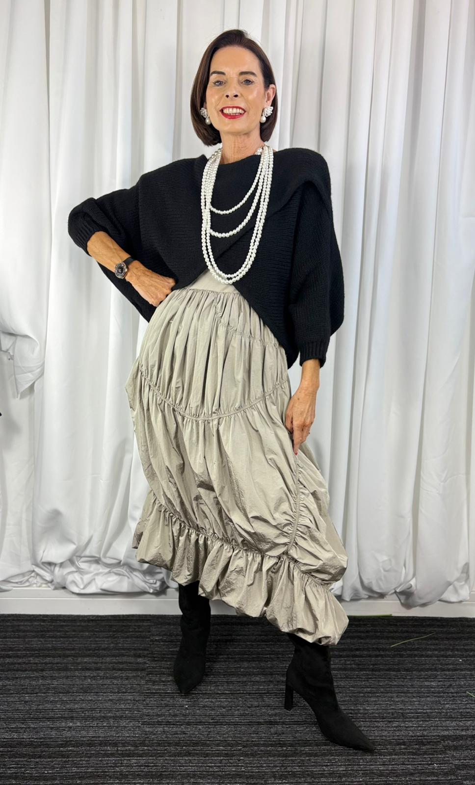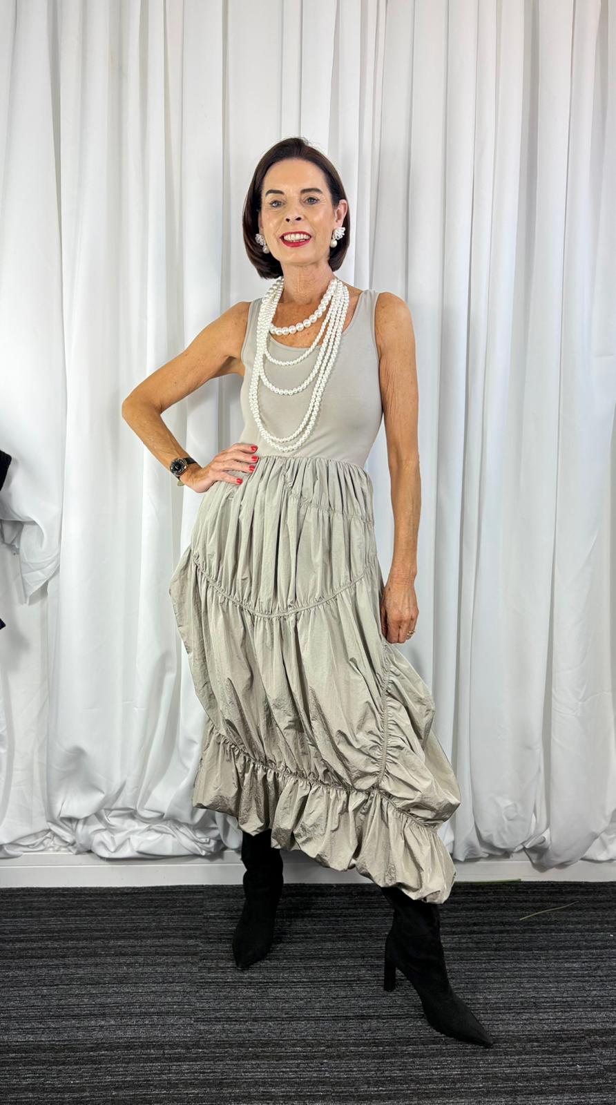 This sleeveless dress features a fitted bodice that flows into a softly gathered, tiered skirt for an elegant and relaxed silhouette. Designed with a round neckline and a flattering seam at the waist, it offers comfortable structure through the top with gentle volume through the skirt. The textured, lightweight fabric adds movement and character, while the mid-length hem creates a versatile finish suitable for both everyday wear and dressed-up occasions. A timeless piece that combines ease, femininity, and understated style.