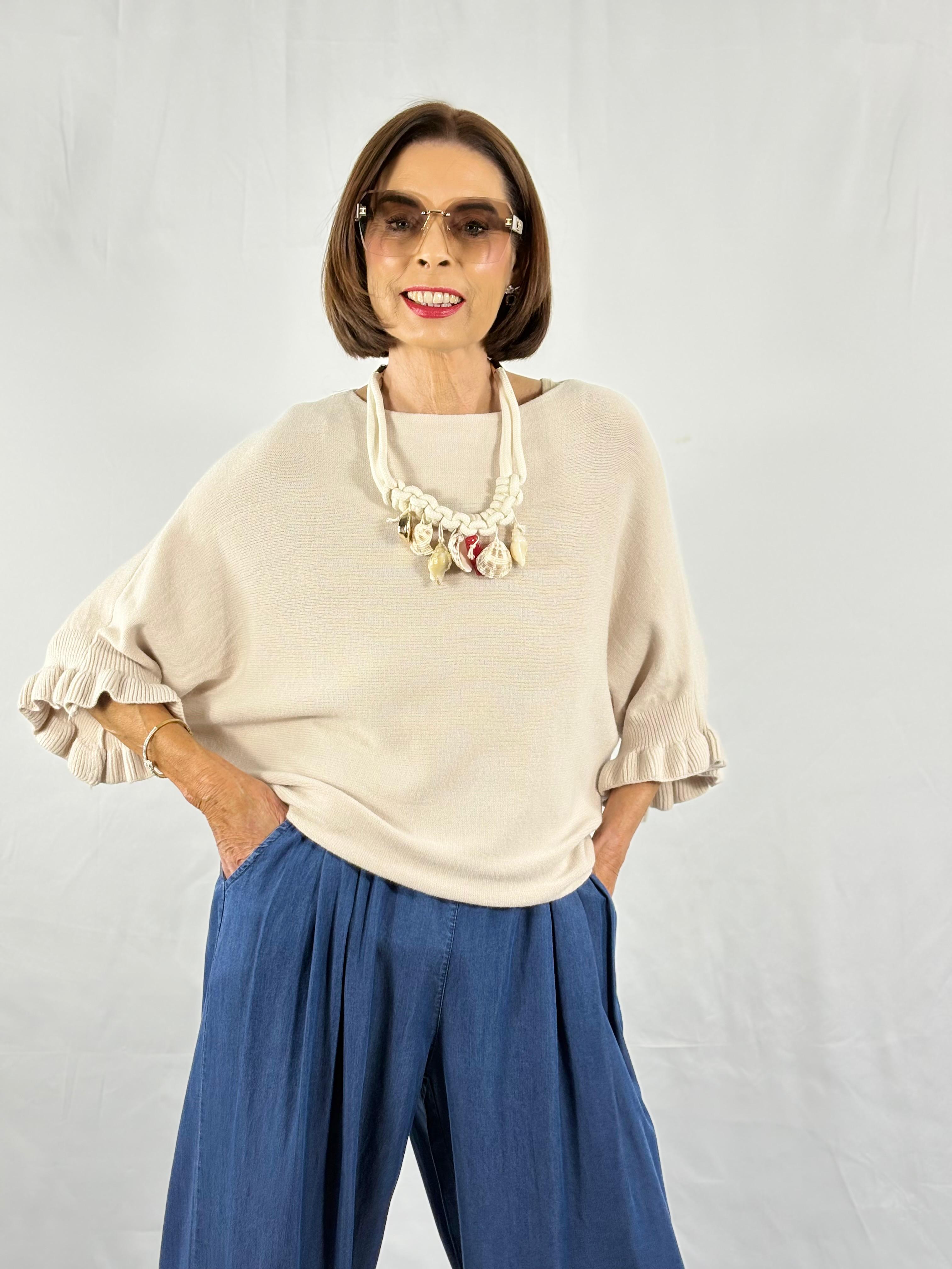 This knitwear piece features a relaxed, slouchy fit with a wide, comfortable neckline that can be worn slightly off the shoulder for a casual look. The design incorporates a dolman or batwing sleeve silhouette, which creates a generous, draped fit through the body. A key charming detail is the frilled or pleated cuff on the three-quarter length sleeves, adding a subtle texture and feminine flair to the overall shape.
