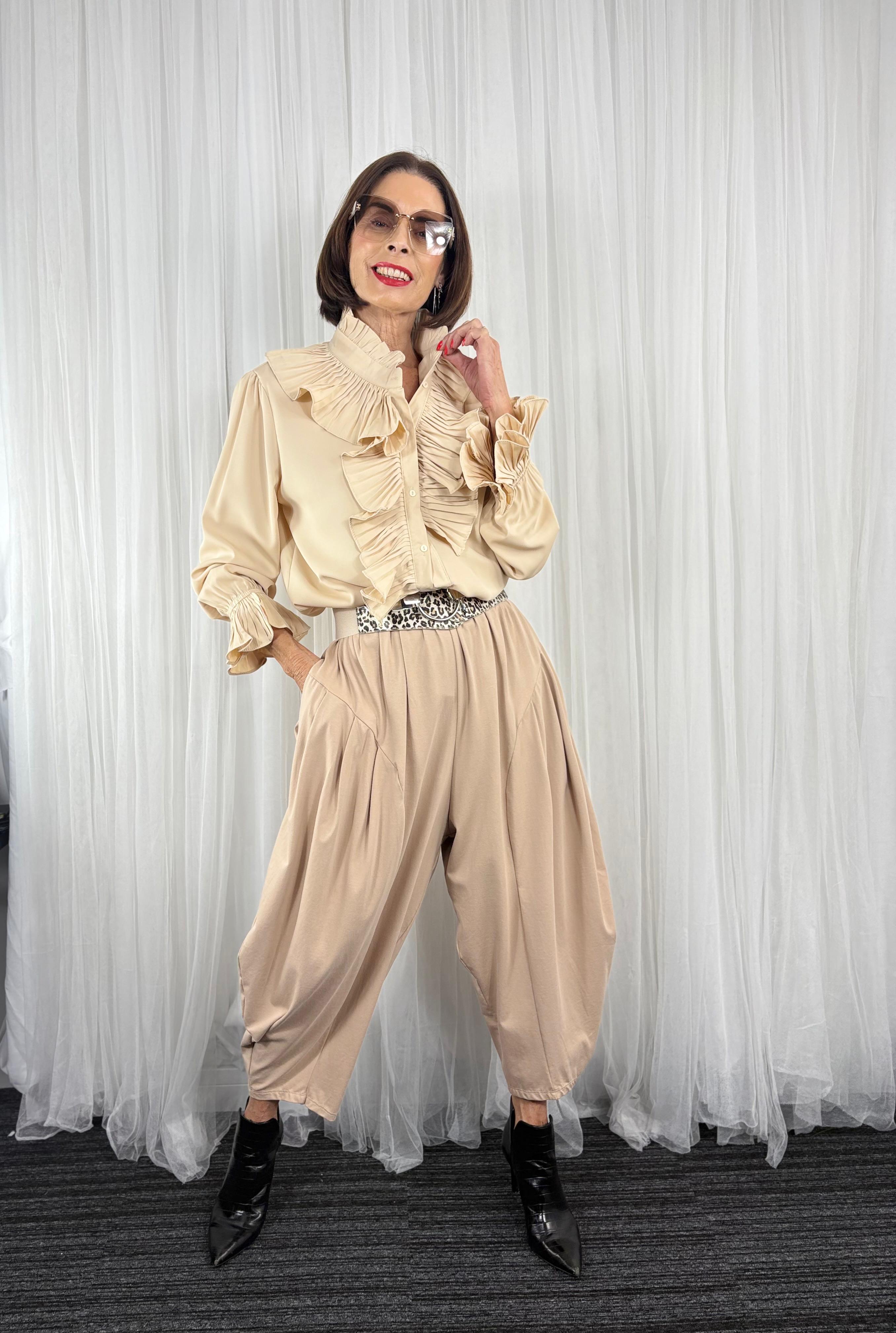 This elegant shirt is defined by delicate ruffle detailing that runs along the front placket and frames the neckline, creating a refined and feminine silhouette. Soft pleating adds texture and movement, while the structured collar lends a polished finish. The gently gathered sleeves are finished with pleated cuffs, offering a graceful balance between classic tailoring and romantic design. Crafted with a smooth, fluid feel, this shirt is perfect for elevating everyday outfits or adding sophistication to more formal looks.