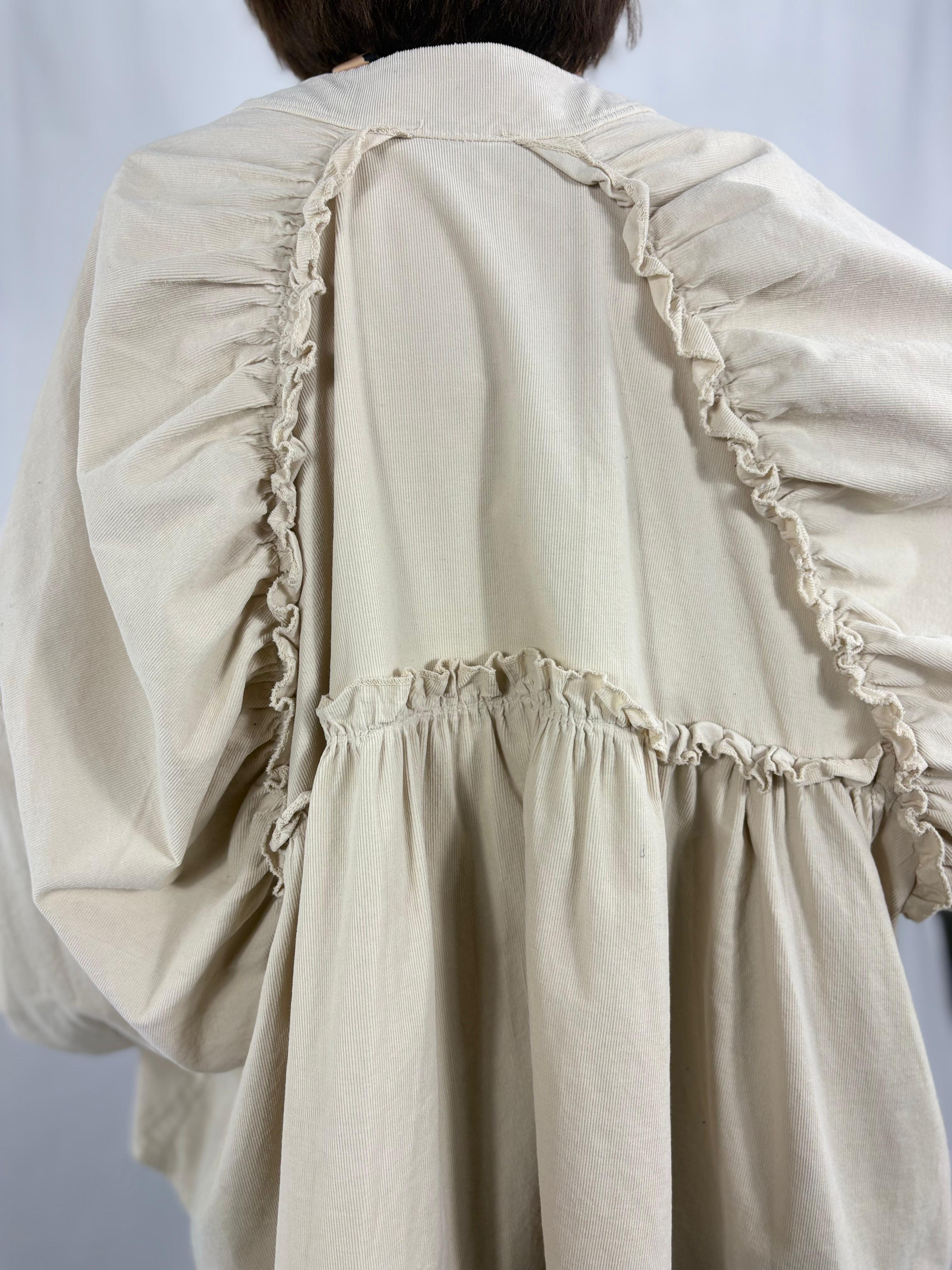 This pin cord top is designed with a relaxed, easy silhouette, featuring a softly gathered neckline that creates a gentle drape through the body and a versatile button-down front that can be worn open or closed. The voluminous sleeves are subtly gathered at the cuffs, adding shape and comfort, while the slightly curved hem gives a flattering, effortless finish. At the back, gathered panel construction adds movement and flow, enhanced by delicate ruffle detailing along the seam lines that creates texture and visual interest.