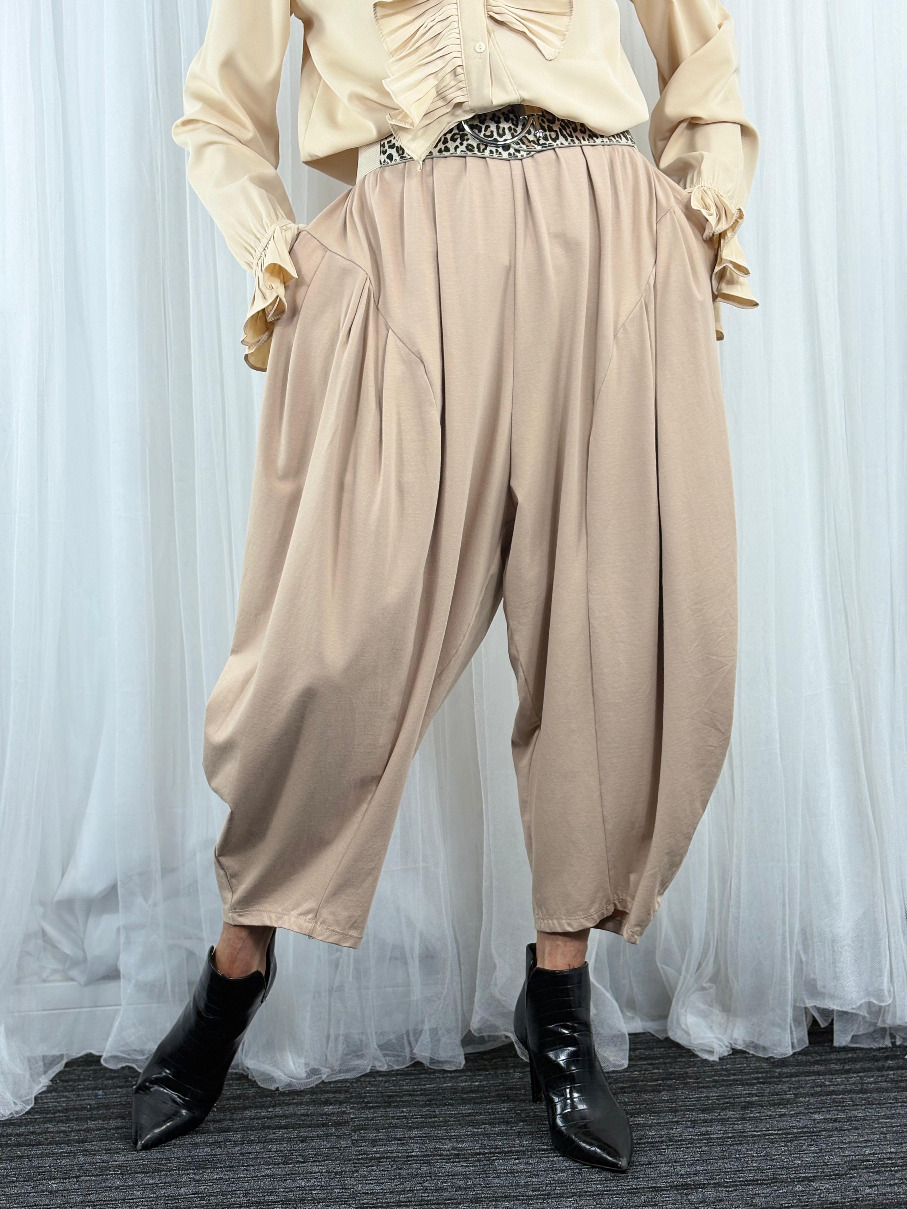 These trousers feature a relaxed, contemporary silhouette with a voluminous shape that tapers gently toward the ankle, creating a flattering and comfortable fit. Designed with a smooth, flowing fabric, they offer ease of movement while maintaining a polished look. The elasticated waistband provides flexibility and comfort, enhanced by subtle seam detailing that adds structure and visual interest.