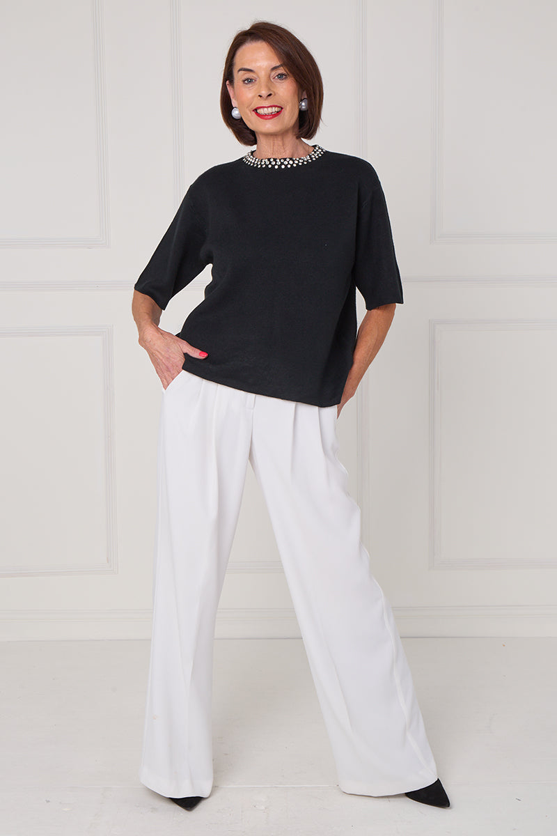 This knitwear piece features elegant three-quarter sleeves and a refined, structured silhouette. The standout detail is its embellished neckline, which adds a touch of sophistication and sparkle to the otherwise minimalist design. Its clean lines and comfortable fit make it versatile enough for both day and evening wear, effortlessly blending style and ease.