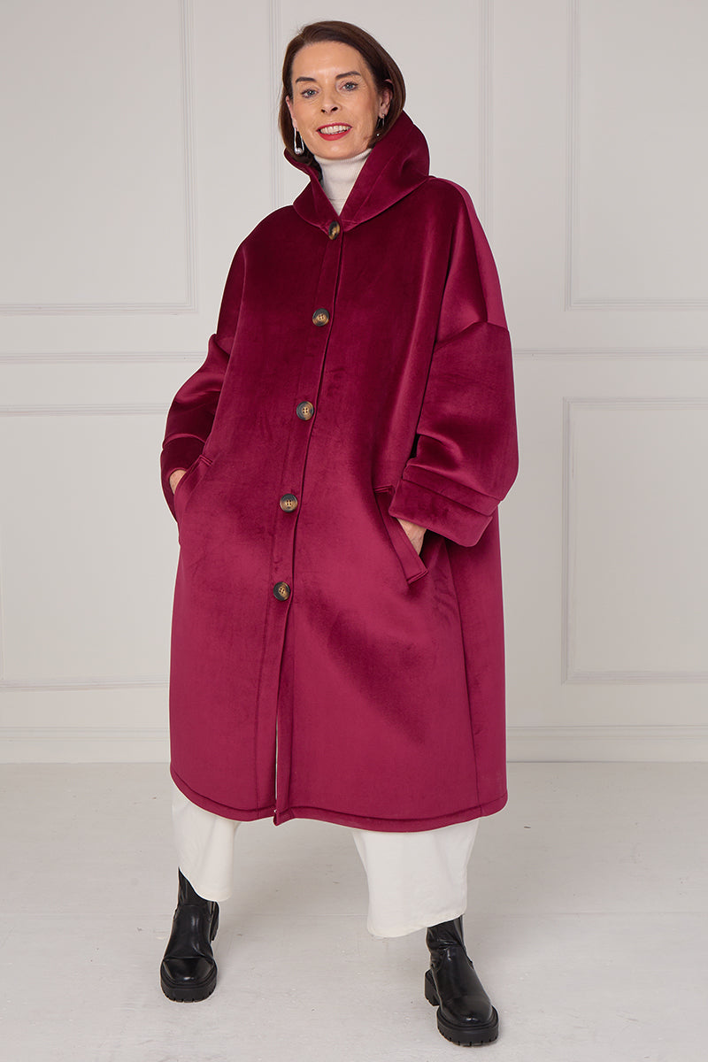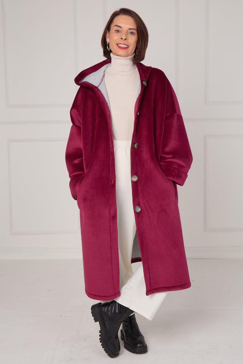 This long coat features a relaxed, oversized silhouette with a cozy hood that adds both comfort and style. Designed with a clean, minimalist look, it is detailed with large front buttons and two practical side pockets, perfect for keeping your hands warm or carrying small essentials. The wide sleeves and smooth finish give it a modern, effortlessly chic appeal, making it an ideal layering piece for cooler days.