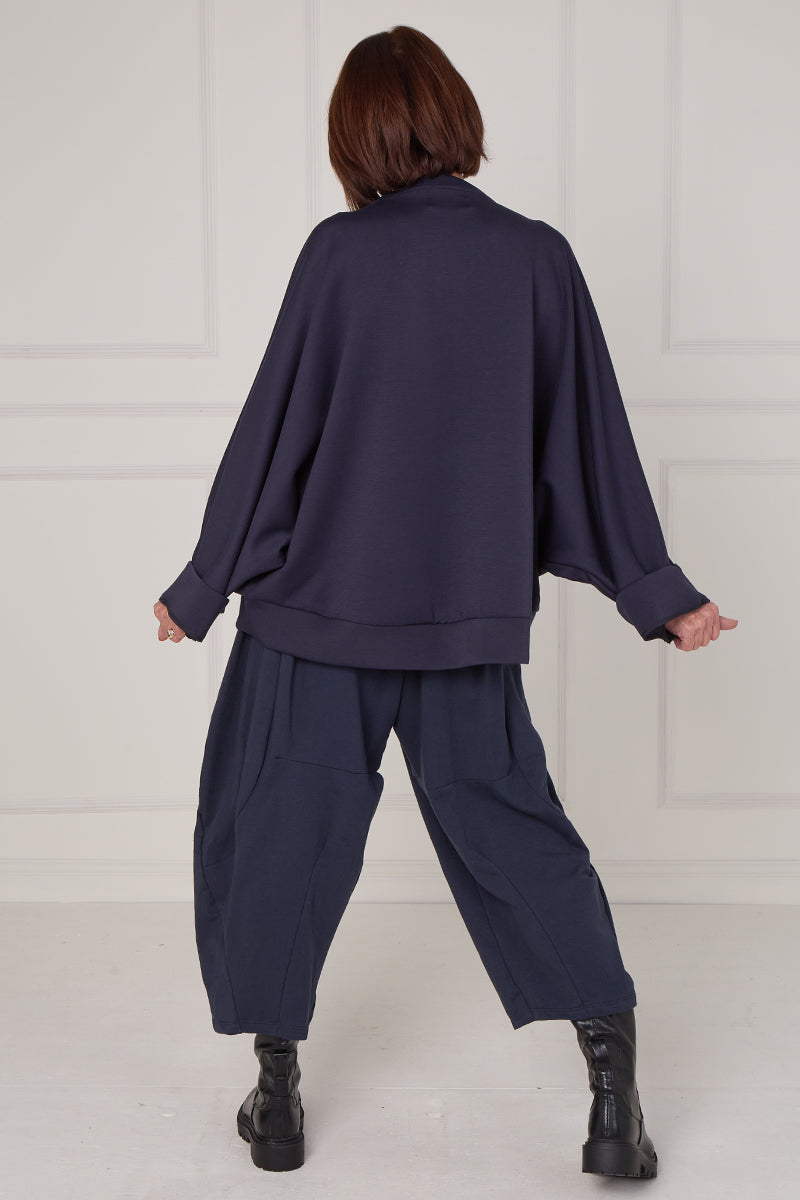 The top is an oversized, relaxed-fit top with a drop-shoulder design and wide sleeves. On the front, it features a large white heart-shaped patch, outlined with intricate silver embroidered stitches in a radiating pattern, giving it a bold and artistic look. The soft fabric and loose cut provide a comfortable, casual-chic style.