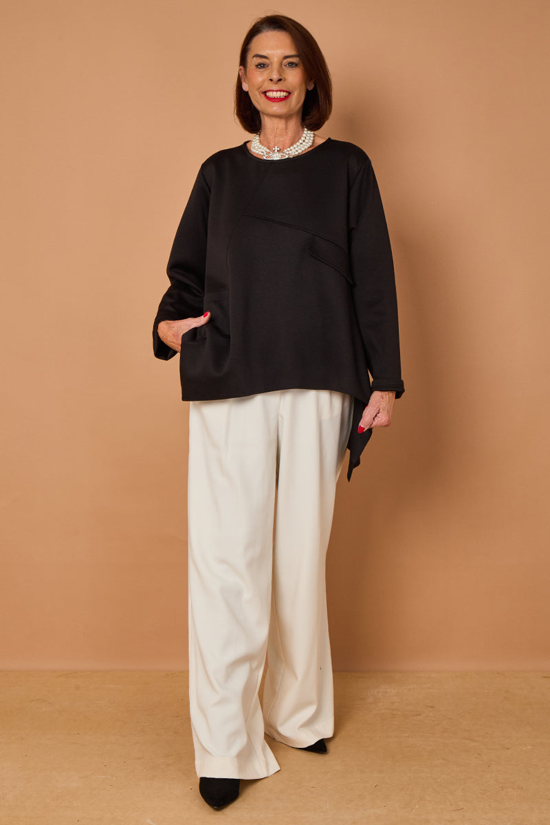 This waterfall top features a flowing, asymmetrical silhouette that drapes gracefully for a flattering and elegant look. The relaxed fit offers comfort while maintaining a sophisticated, modern style. Designed with long sleeves and distinctive seam detailing, it adds subtle texture and visual interest. Front patch pockets enhance its casual charm and practicality. Perfect for effortless layering, this top brings a touch of relaxed refinement to any outfit.