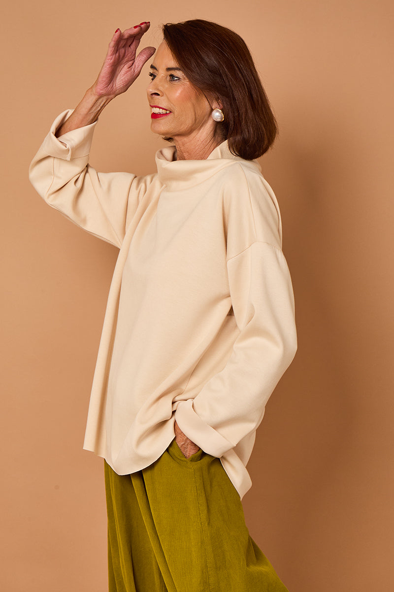This top features a relaxed, elegant silhouette with a soft, draped cowl neckline that adds a touch of sophistication. Crafted from a smooth, structured fabric, it offers both comfort and style for everyday wear. The dropped shoulders and loose fit create a modern, effortless look. Subtle rolled cuffs enhance its minimalist appeal. Perfect for pairing with tailored pants or skirts for a refined yet casual outfit.