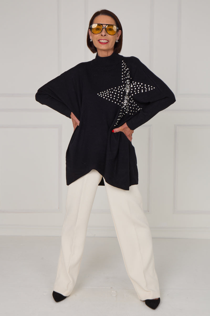 This stylish knit sweater brings a bold yet effortless flair to everyday dressing, designed with a relaxed, easy-to-wear silhouette that offers both comfort and polish. Its standout feature is the striking embellished star motif across the front, created with shimmering studs that add eye-catching sparkle and modern attitude. Perfect for pairing with anything from tailored trousers to casual denim, this piece delivers a chic, elevated look with minimal effort.