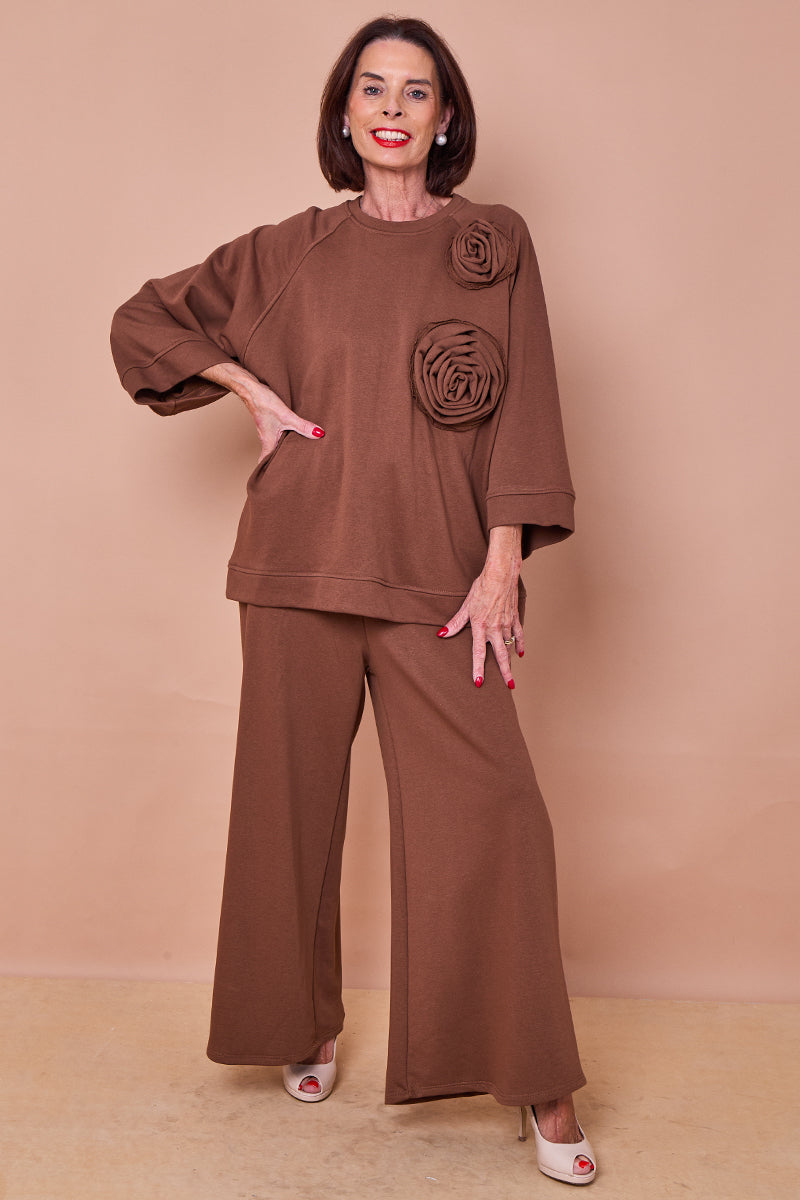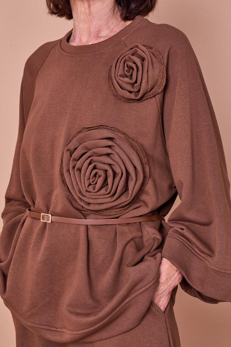 Elevate your casual wear with this exceptionally unique Sculpted Flower Appliqué Top. This knit piece features a comfortable, slightly oversized silhouette with a smooth, cozy texture. The standout details are the two large, intricately layered fabric flower appliqués positioned on the shoulder and chest, adding a three-dimensional, artistic touch. The top boasts a classic crew neckline and relaxed three-quarter length sleeves.