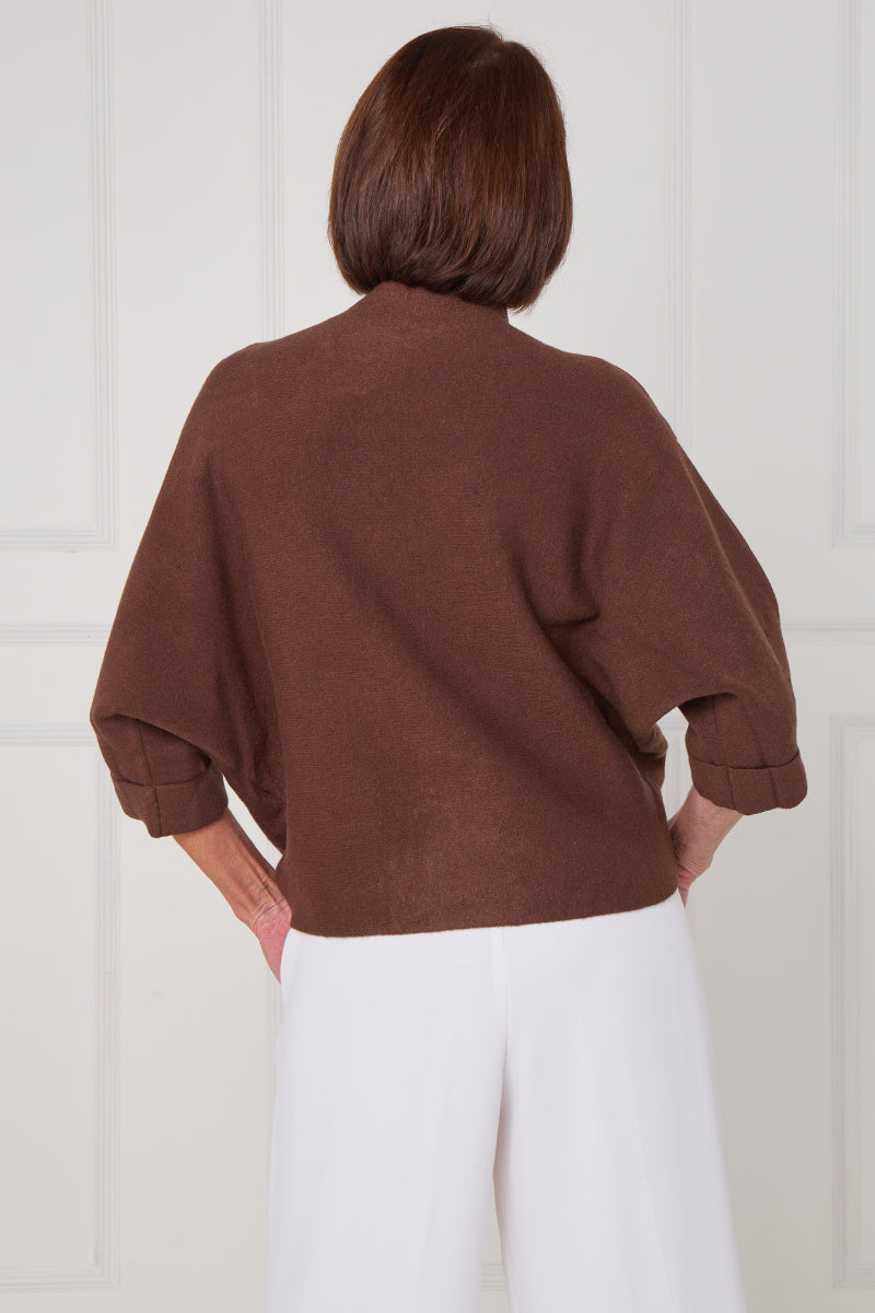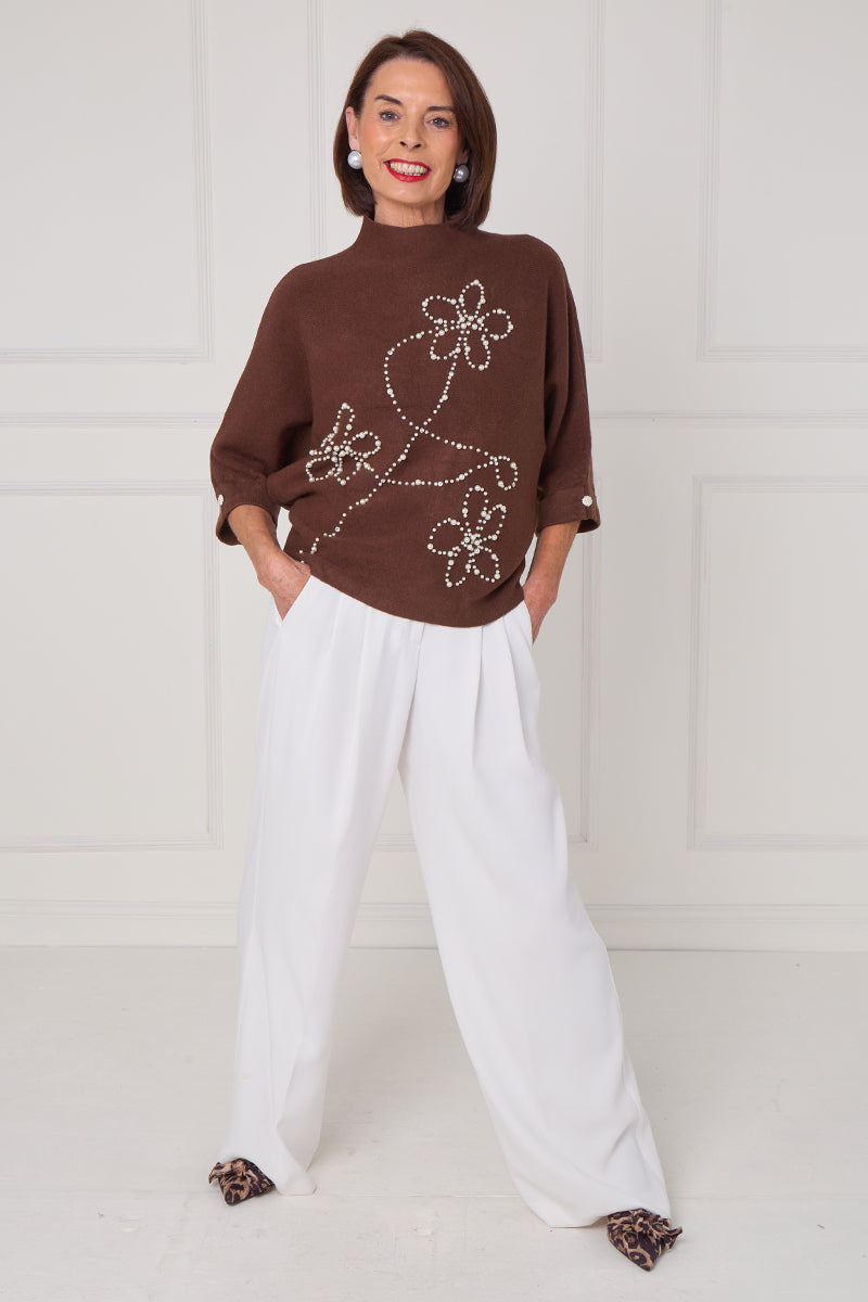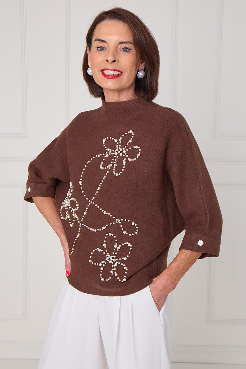 This sophisticated piece is a knitwear top featuring luxurious pearl and diamanté embellishments. Crafted from a soft-looking knit fabric, the top has a relaxed fit throughout the body with a subtle mock neck and long sleeves finished with fitted cuffs. The focal point is the elaborate, dense detailing across the chest and shoulders, where clusters of sparkling rhinestones and iridescent pearls are arranged in a festive, decorative pattern