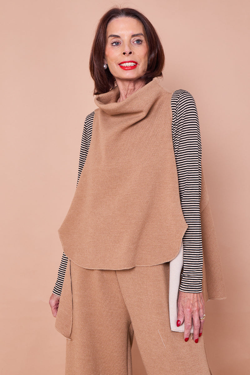 This contemporary layering top is a relaxed-fit vest crafted from a soft, camel-toned knit material. It features an architectural silhouette defined by a high, draped cowl or roll neckline and an asymmetrical, flared hemline that falls loosely over the hips. The sleeveless design allows for easy layering, showcased here over a contrasting fine-gauge striped long-sleeve top. The overall aesthetic is one of elevated comfort and sophisticated modern volume.