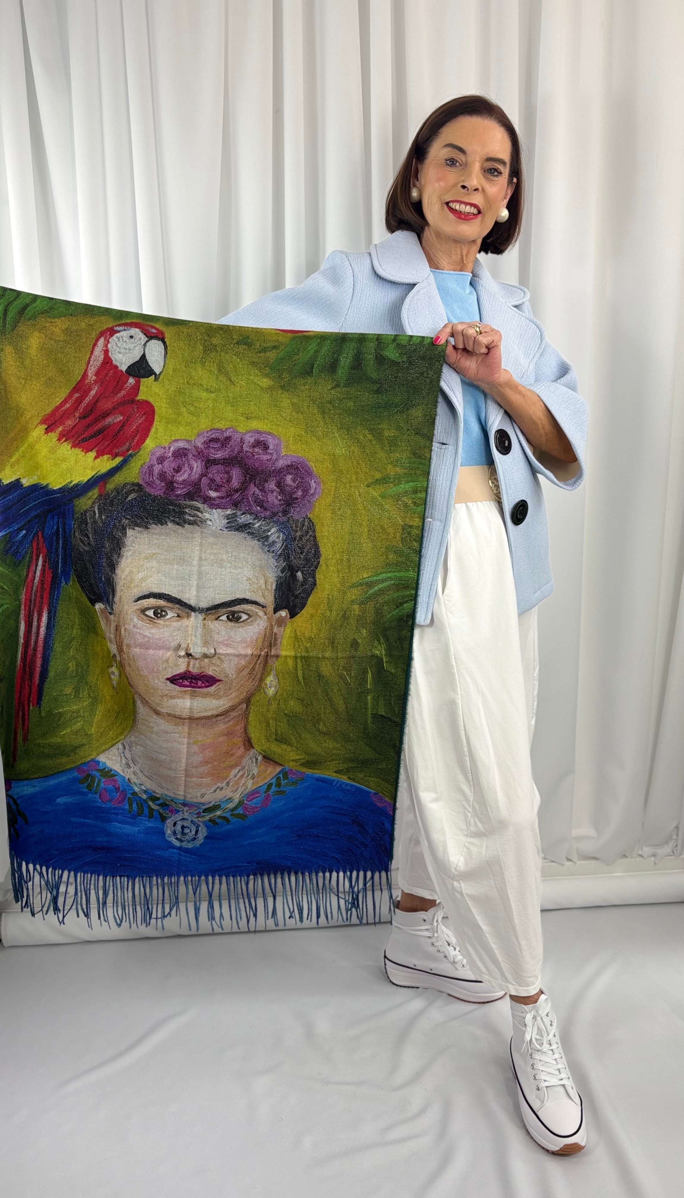 This statement scarf showcases an artistic portrait print, beautifully blended with floral and botanical motifs. Crafted from a lightweight, fluid fabric, it drapes effortlessly for an elegant silhouette. Delicate fringe detailing along the edges adds movement and a refined finishing touch. A distinctive accessory designed to elevate both occasionwear and sophisticated everyday styling.