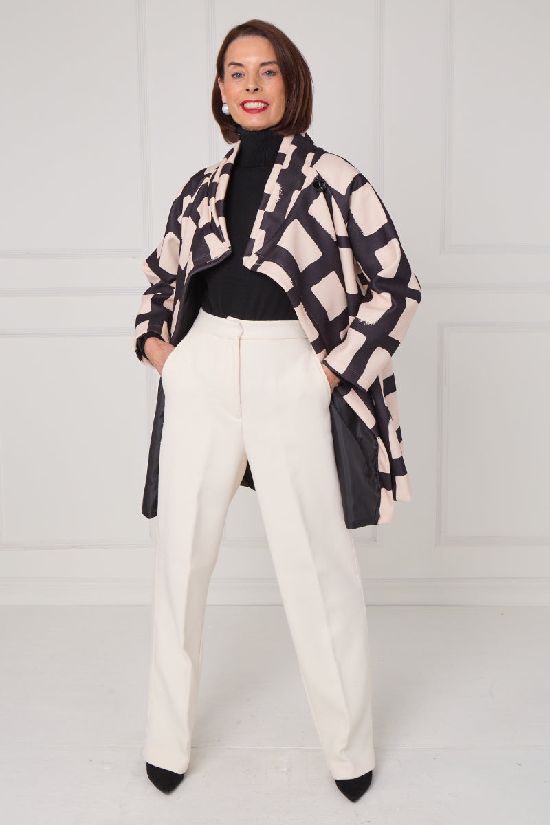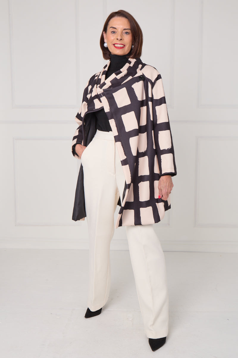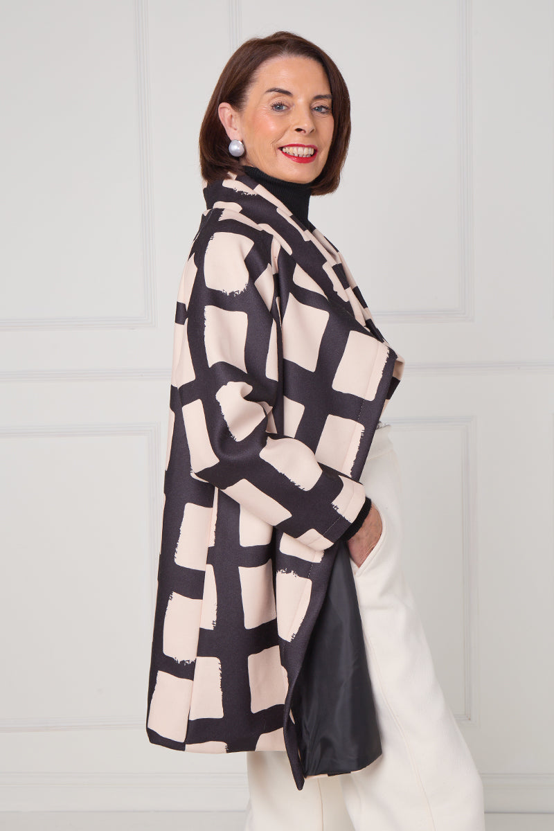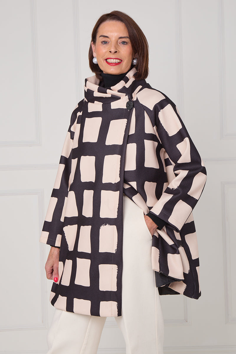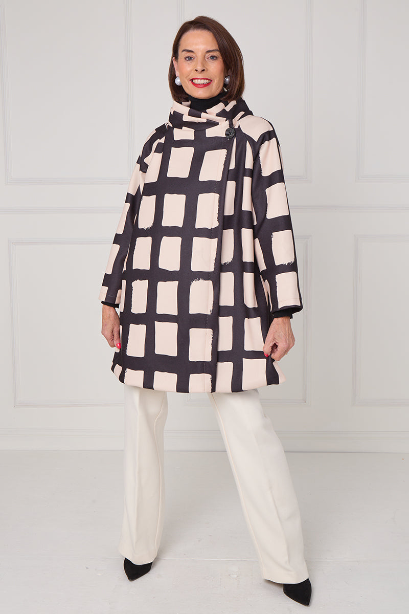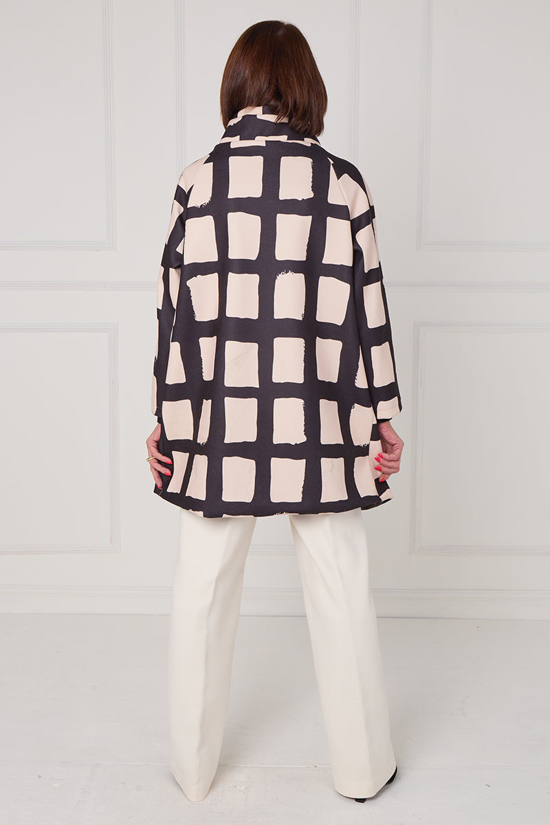 This elegant statement jacket showcases a bold geometric grid pattern in contrasting tones of black and soft beige, offering a sophisticated modern flair. Designed with a high funnel collar and a single decorative button closure, it combines structure with effortless drape. The relaxed silhouette and three-quarter sleeves provide comfort and movement, making it ideal for layering. Perfect for both day and evening wear, this piece exudes refined contemporary style.