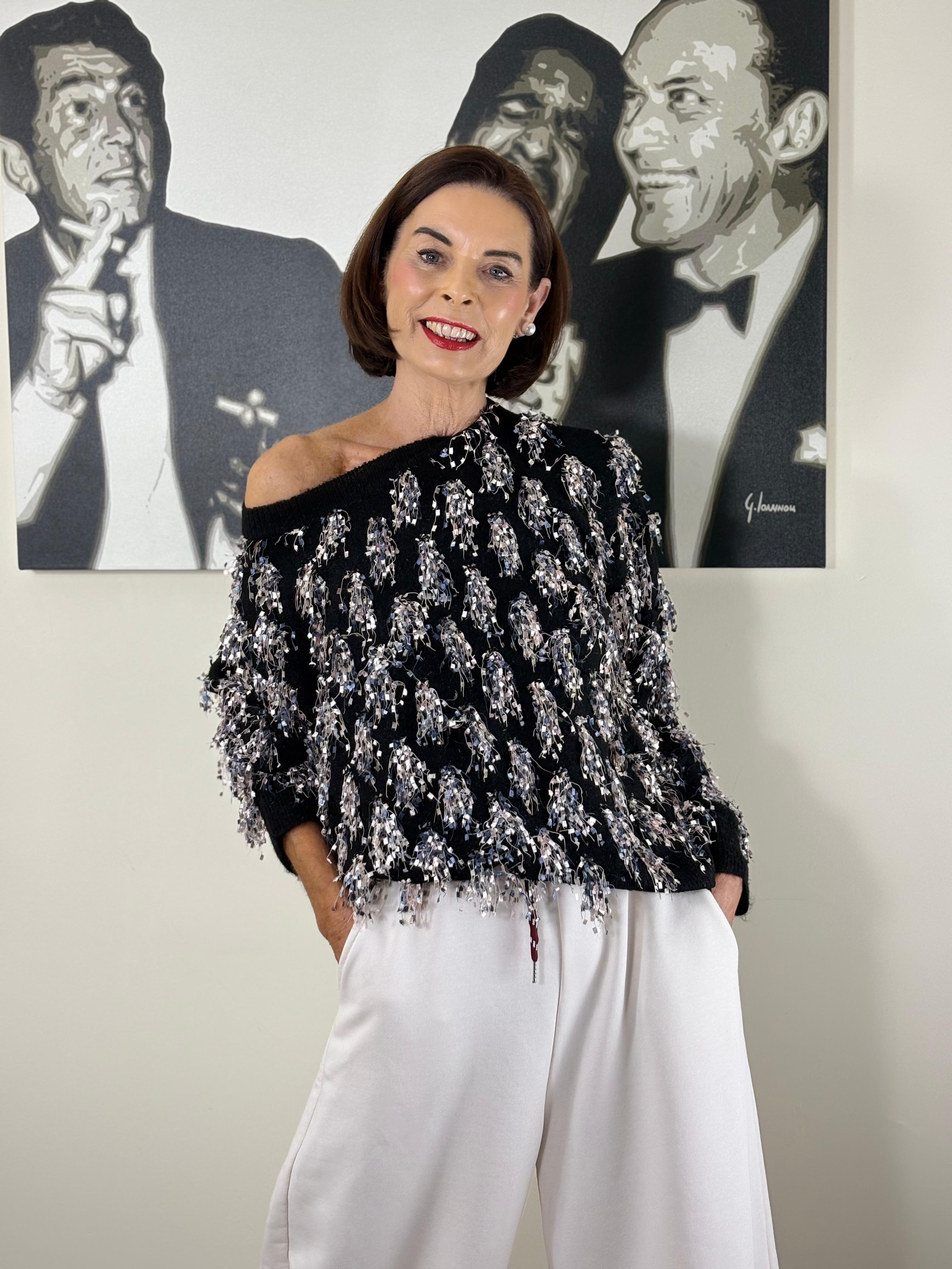 This knitwear features an elegant, contemporary design with a soft, structured silhouette. It has a relaxed fit that drapes effortlessly, enhanced by a subtle off-shoulder neckline that adds a refined, modern edge. The surface is richly textured with intricate, tactile embellishments that create depth and movement, giving the piece a statement quality without feeling heavy. Finished with ribbed edges for comfort and structure, it balances sophistication with ease.