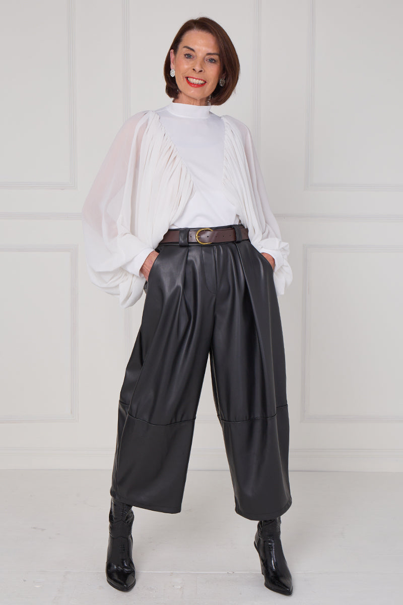 These PU trousers are a stylish and modern statement piece crafted from sleek, leather-look polyurethane. Designed with a high waist and structured pleats at the front, they feature a voluminous, wide-leg silhouette that falls to a cropped length. The trousers are finished with practical side pockets and visible seam detailing around the knees, adding a contemporary edge. Paired with a belt and heeled boots, they offer a chic and confident look perfect for both day and evening wear.