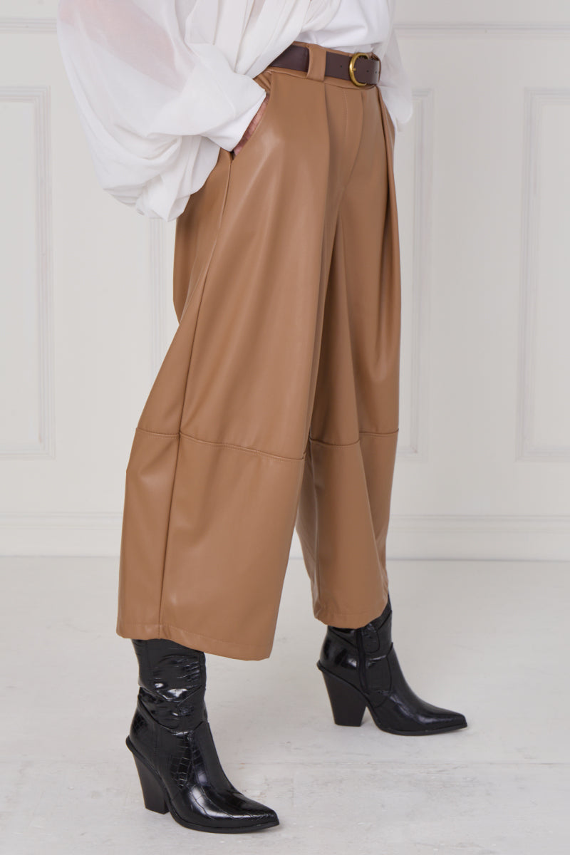 These PU trousers are a stylish and modern statement piece crafted from sleek, leather-look polyurethane. Designed with a high waist and structured pleats at the front, they feature a voluminous, wide-leg silhouette that falls to a cropped length. The trousers are finished with practical side pockets and visible seam detailing around the knees, adding a contemporary edge. Paired with a belt and heeled boots, they offer a chic and confident look perfect for both day and evening wear.
