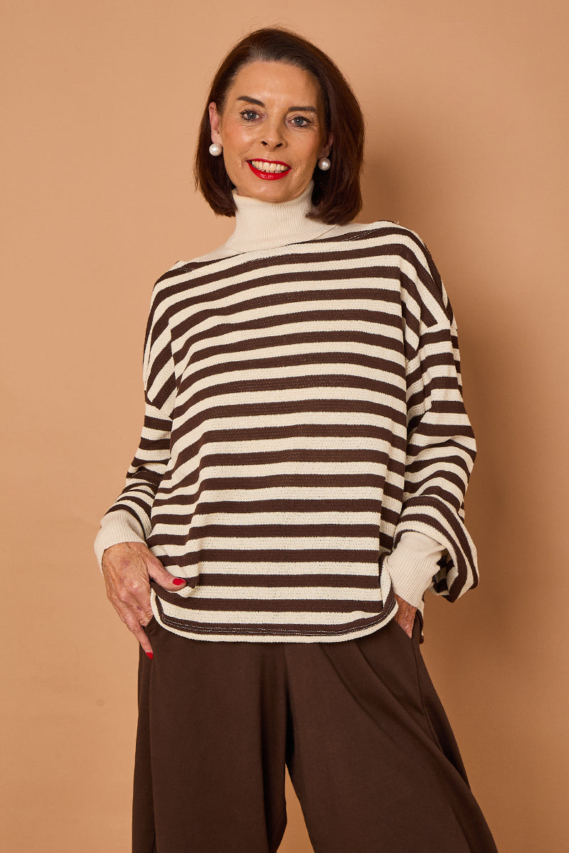 The model is wearing a chic, layered knit ensemble featuring a wide-necked, oversized striped jumper with horizontal stripes. This jumper is layered over a fitted, roll neck top, which you have identified as the Patchouli top. The visible roll neck, cuffs, and hem of the striped jumper share the same cream tone, creating a cohesive, classic look.