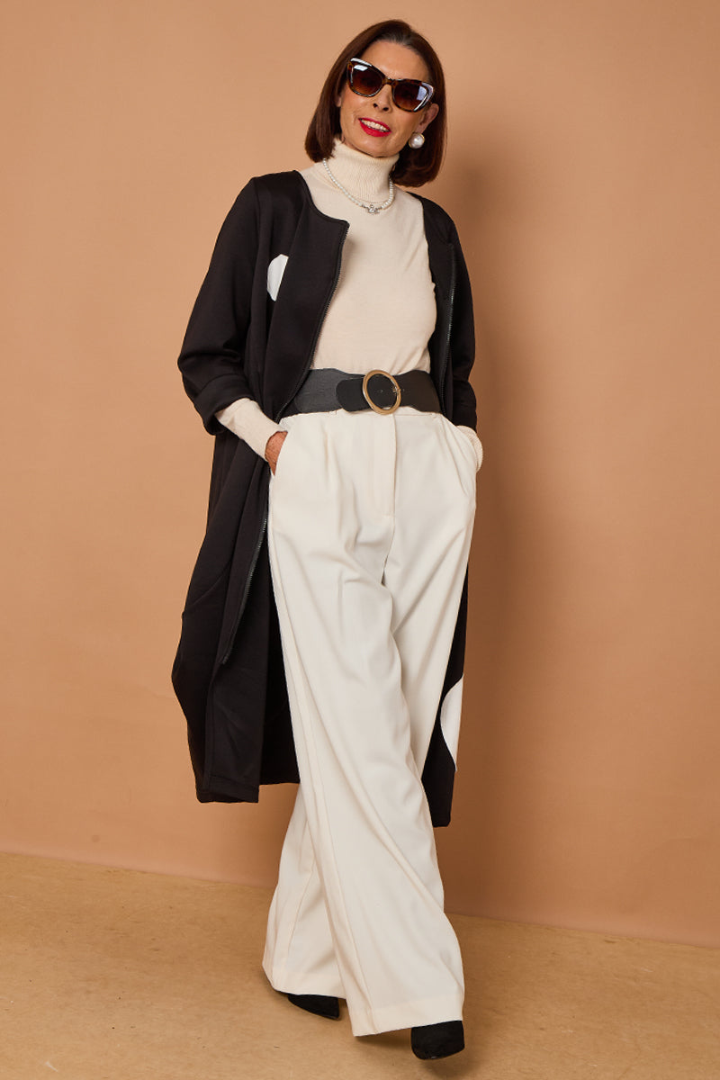 This jacket showcases a modern oversized silhouette with bold circular accents that add a playful touch. Designed with a front zip closure, it combines practicality with contemporary style. The relaxed fit and softly draped fabric create a flattering, comfortable shape. Rolled cuffs and spacious side pockets enhance its casual sophistication. Perfect for layering, this statement piece effortlessly blends comfort and creativity.