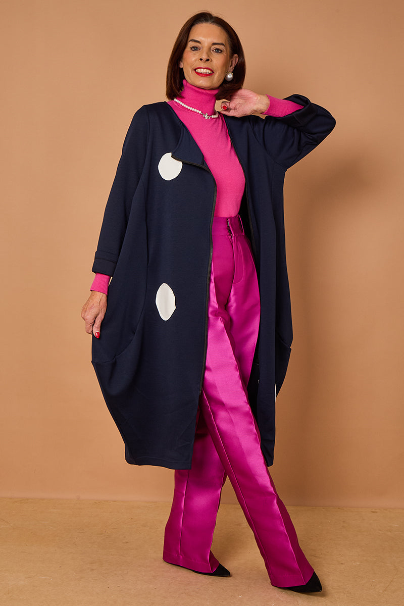 This jacket showcases a modern oversized silhouette with bold circular accents that add a playful touch. Designed with a front zip closure, it combines practicality with contemporary style. The relaxed fit and softly draped fabric create a flattering, comfortable shape. Rolled cuffs and spacious side pockets enhance its casual sophistication. Perfect for layering, this statement piece effortlessly blends comfort and creativity.