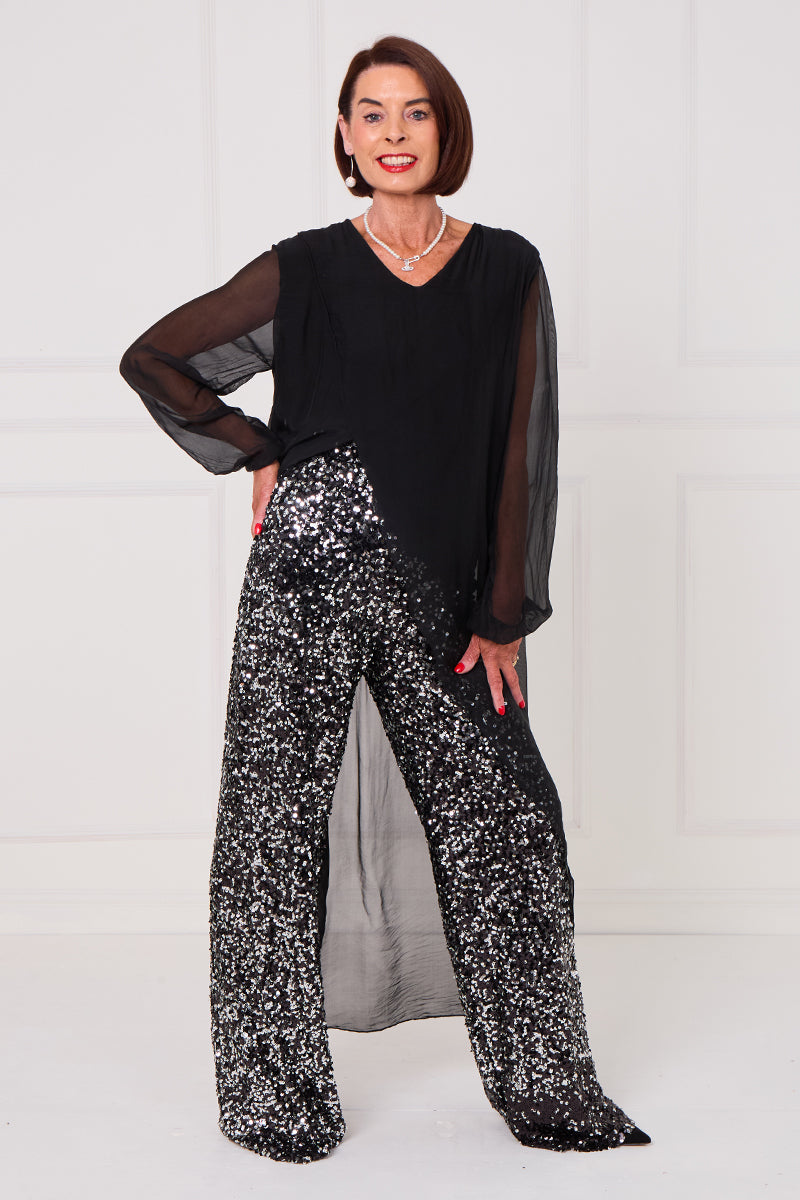 The trousers in the image are high-waisted and fully covered in diamante embellishment, creating a dazzling, light-catching effect. They feature a straight-leg silhouette that drapes elegantly from the hips to the floor, offering a sleek and elongating appearance. The inner lining provides comfort and ease of movement, balancing the intricate exterior. Designed for standout style, these trousers exude glamour and sophistication, making them perfect for evening events or special occasions.