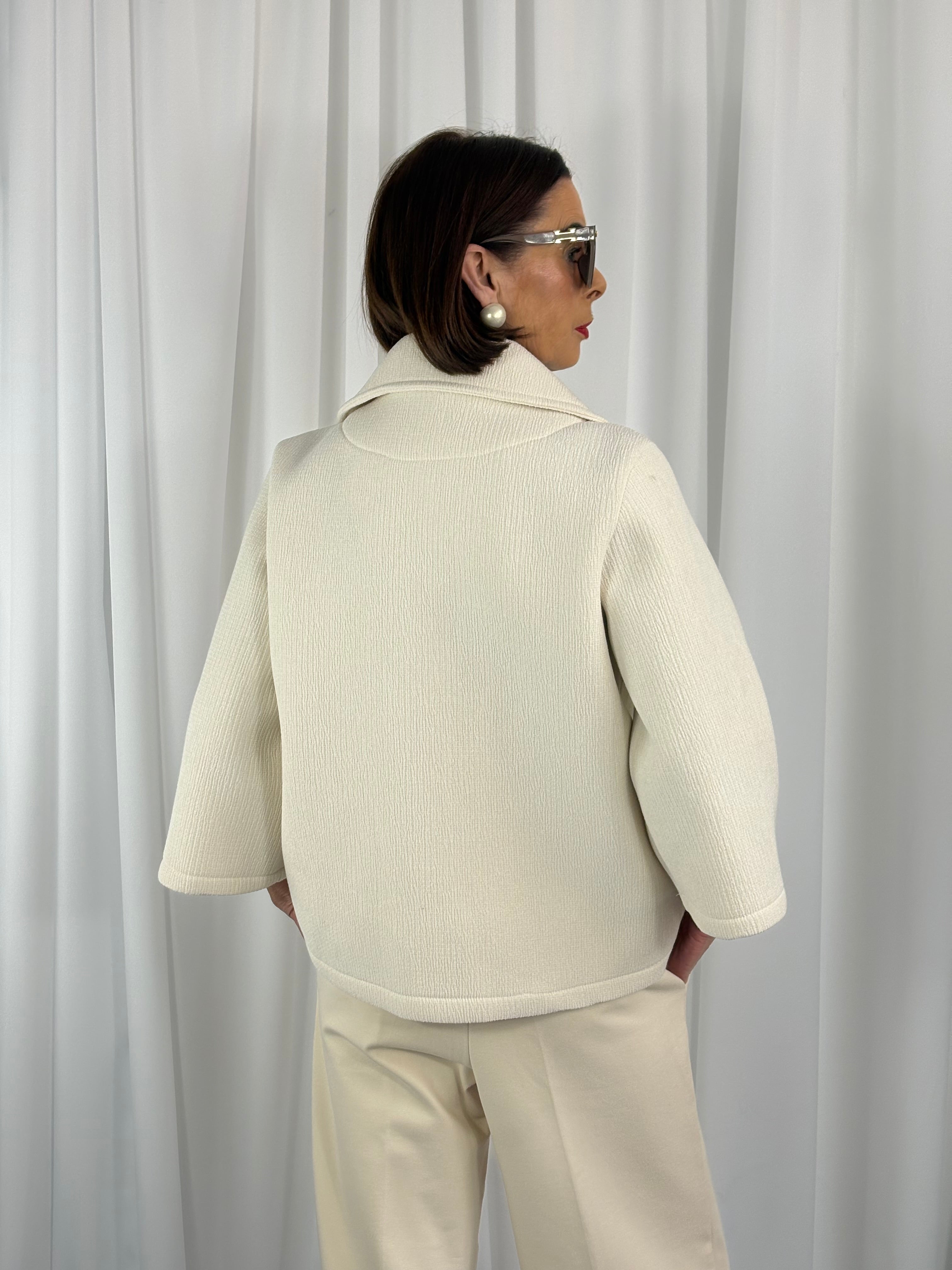 This elegant jacket features a refined textured fabric with a structured, tailored silhouette.