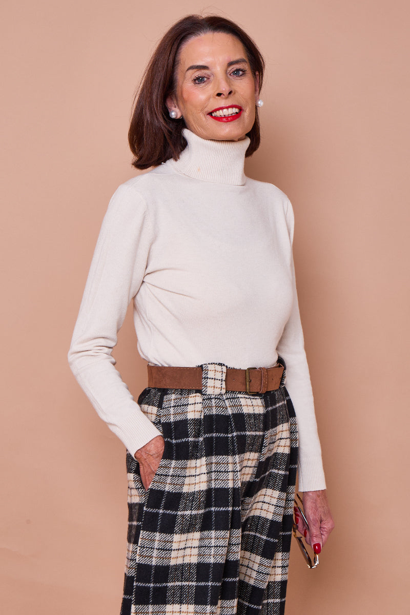 This is a classic, fitted roll neck (or turtleneck) top in a soft, light cream or ivory hue. The knit appears to be fine-gauge, suggesting a smooth texture and a comfortable feel. It has long, set-in sleeves and is worn tucked in, indicating a length that hits at or below the waist. The high roll neck is substantial, providing warmth and a timeless silhouette.