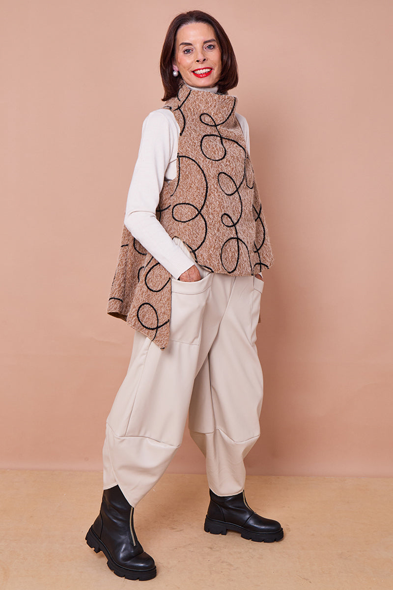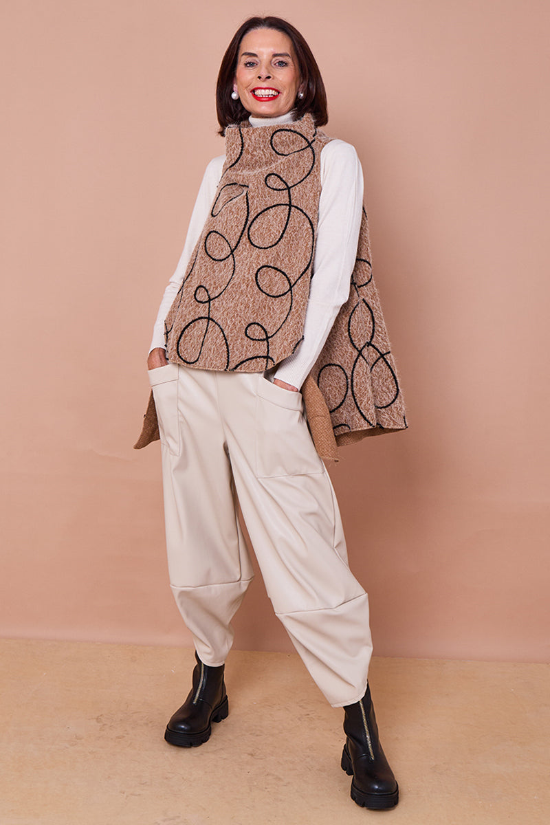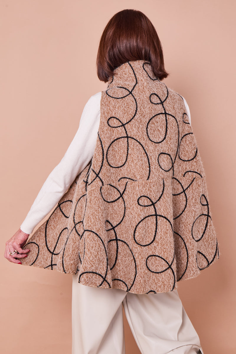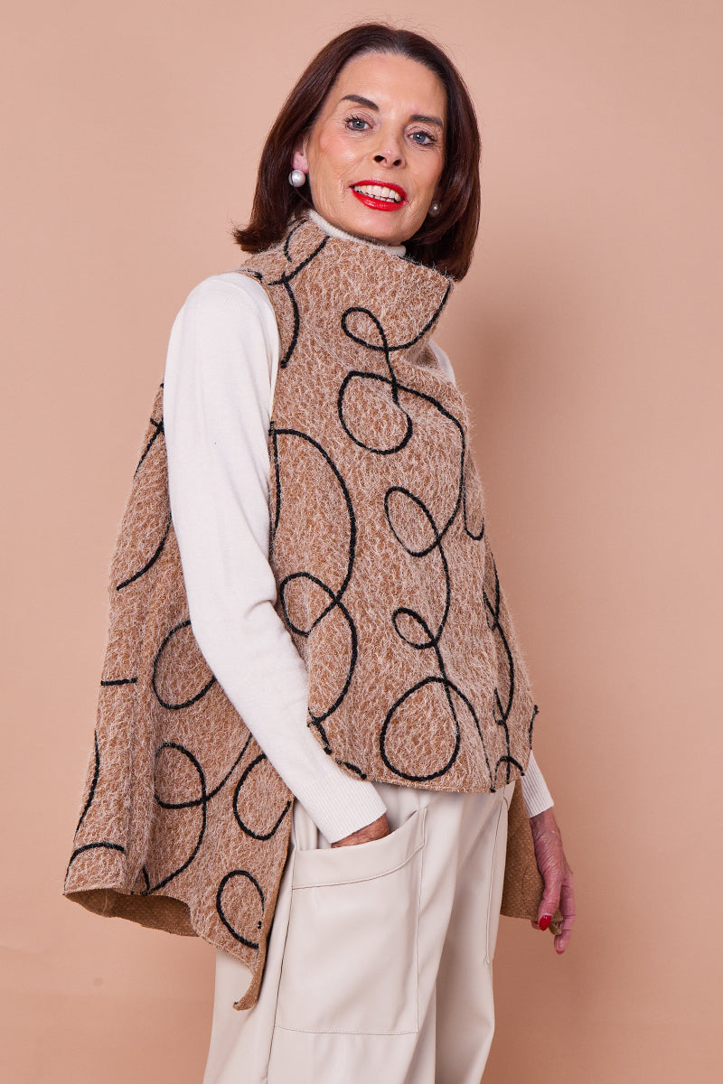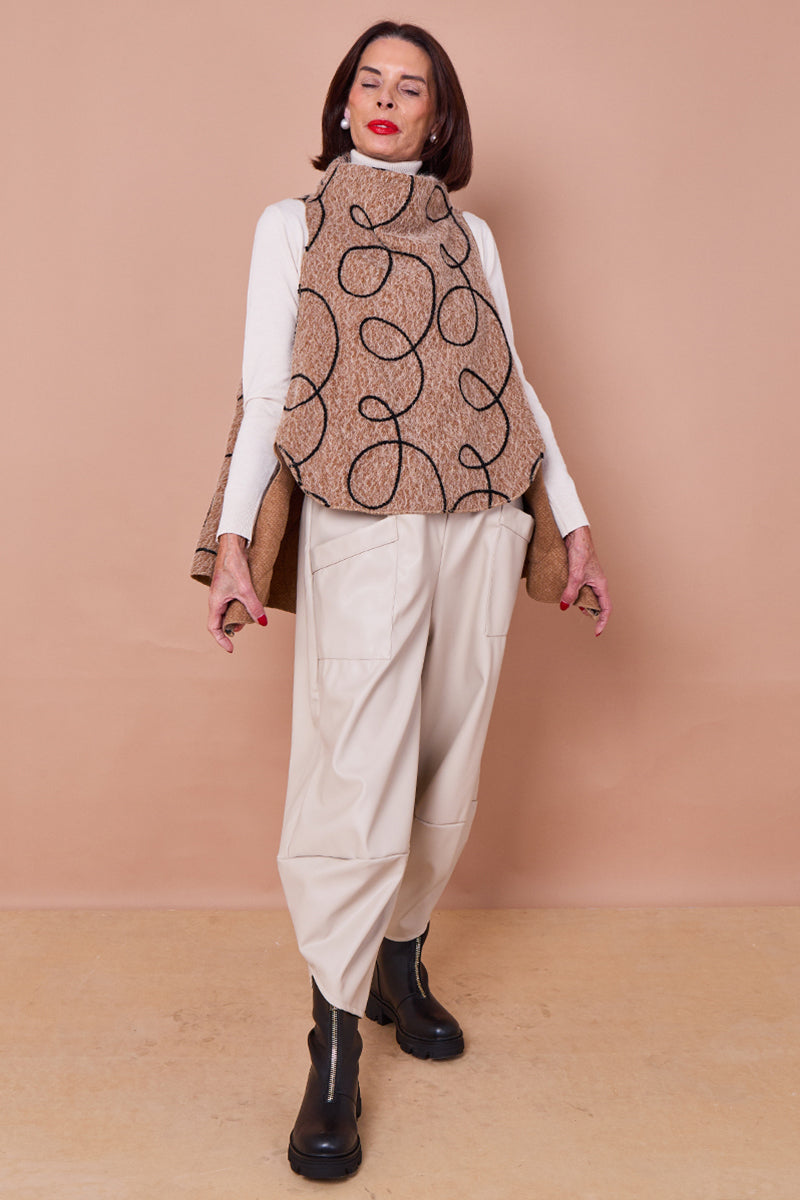 This is a statement waterfall vest or capelet in a thick, textured camel felted wool or knit fabric. The garment features an eye-catching, abstract pattern of large, continuous white swirls or loops, which are applied as a textural contrast, possibly in a raised embroidery or applique. The piece has an open, flowing fit that drapes over the shoulders and torso. The 'waterfall' description applies to its asymmetrical and flowing hem.