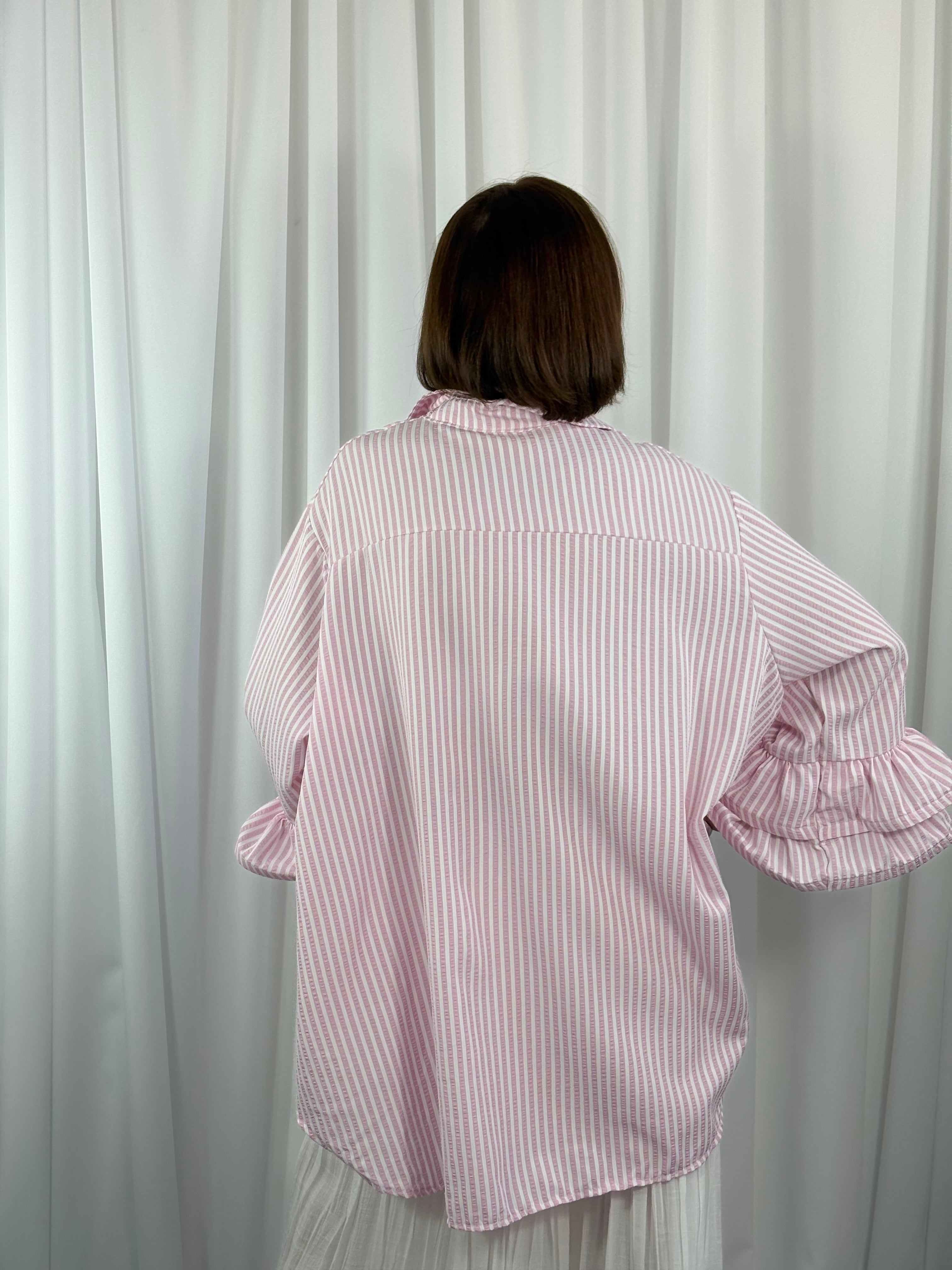 This shirt features a relaxed, flowing silhouette with a modern, effortless feel. Designed with a classic collar and button-down front, it blends timeless tailoring with playful detailing. The standout element is its dramatic tiered ruffle sleeves, which add movement and a touch of statement style. Crafted in a lightweight, breathable fabric with a subtle textured pattern, it drapes beautifully and offers all-day comfort.