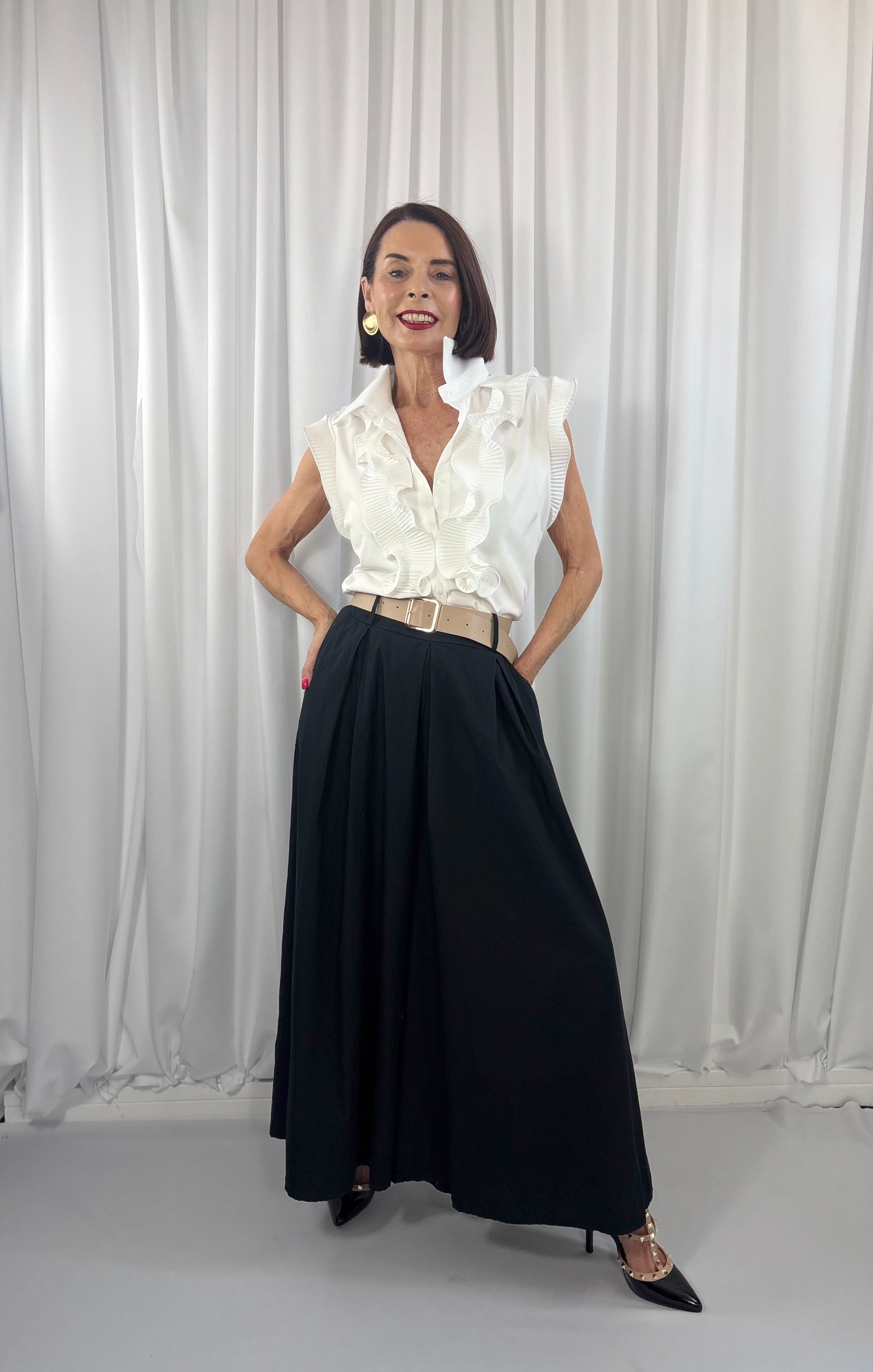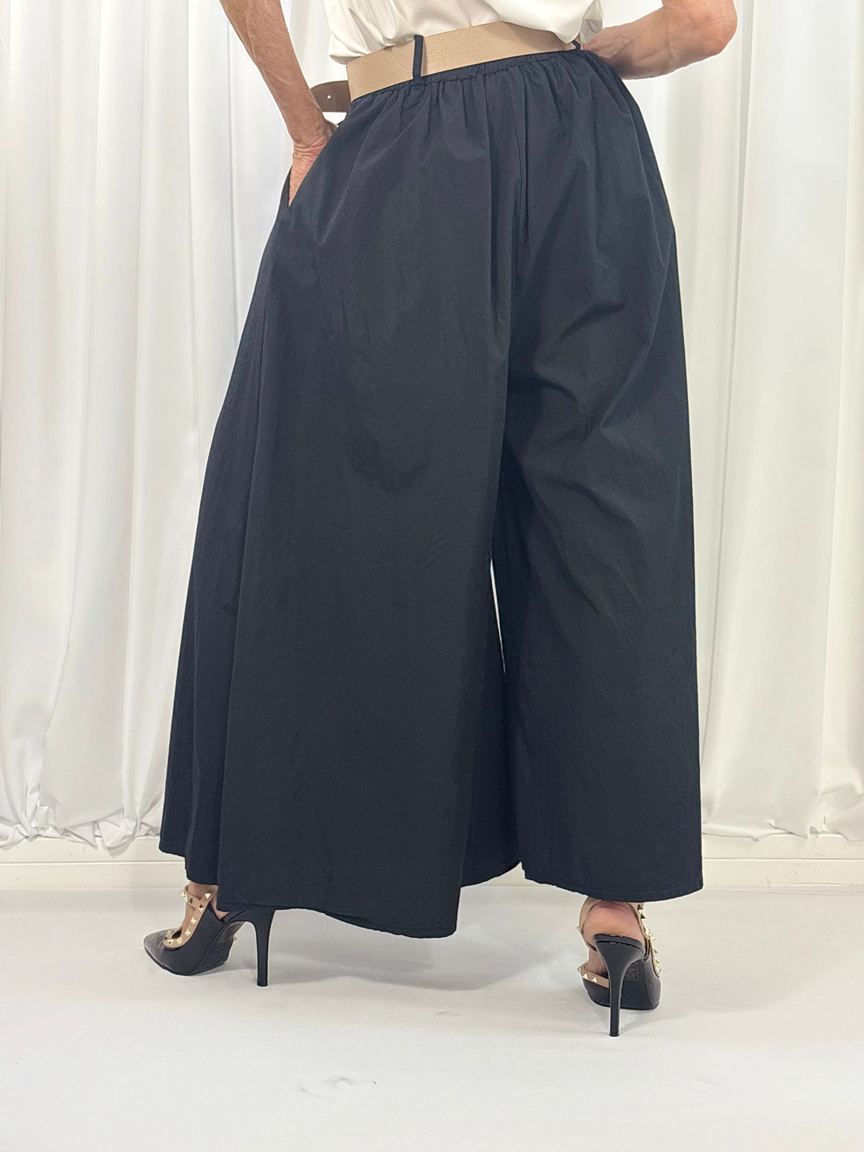 - Flowy palazzo silhouette with a wide-leg cut for effortless movement