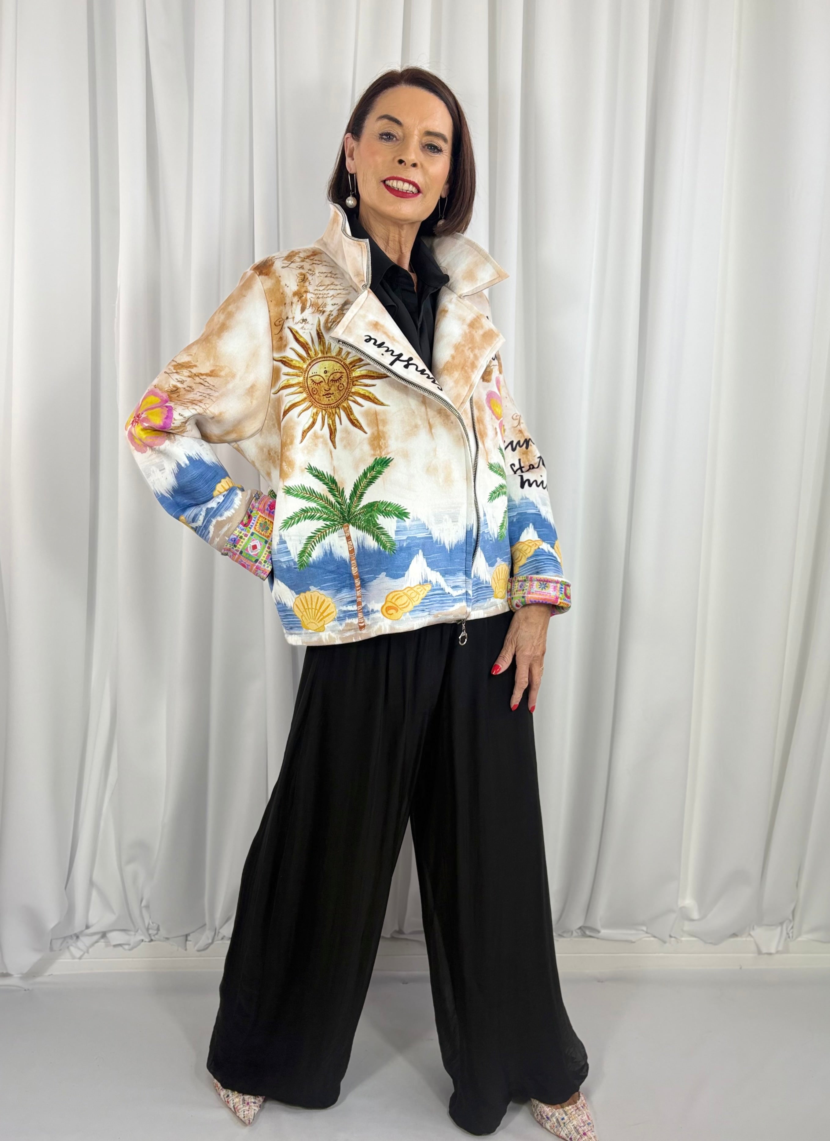 • This garment features a sun-drenched beach theme, showcasing a central celestial sun motif and coastal elements like palm trees, seashells, and ocean waves.